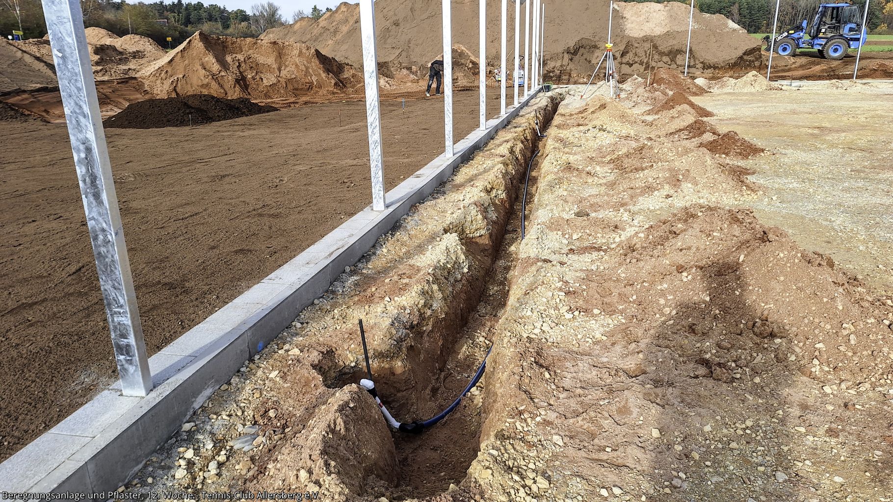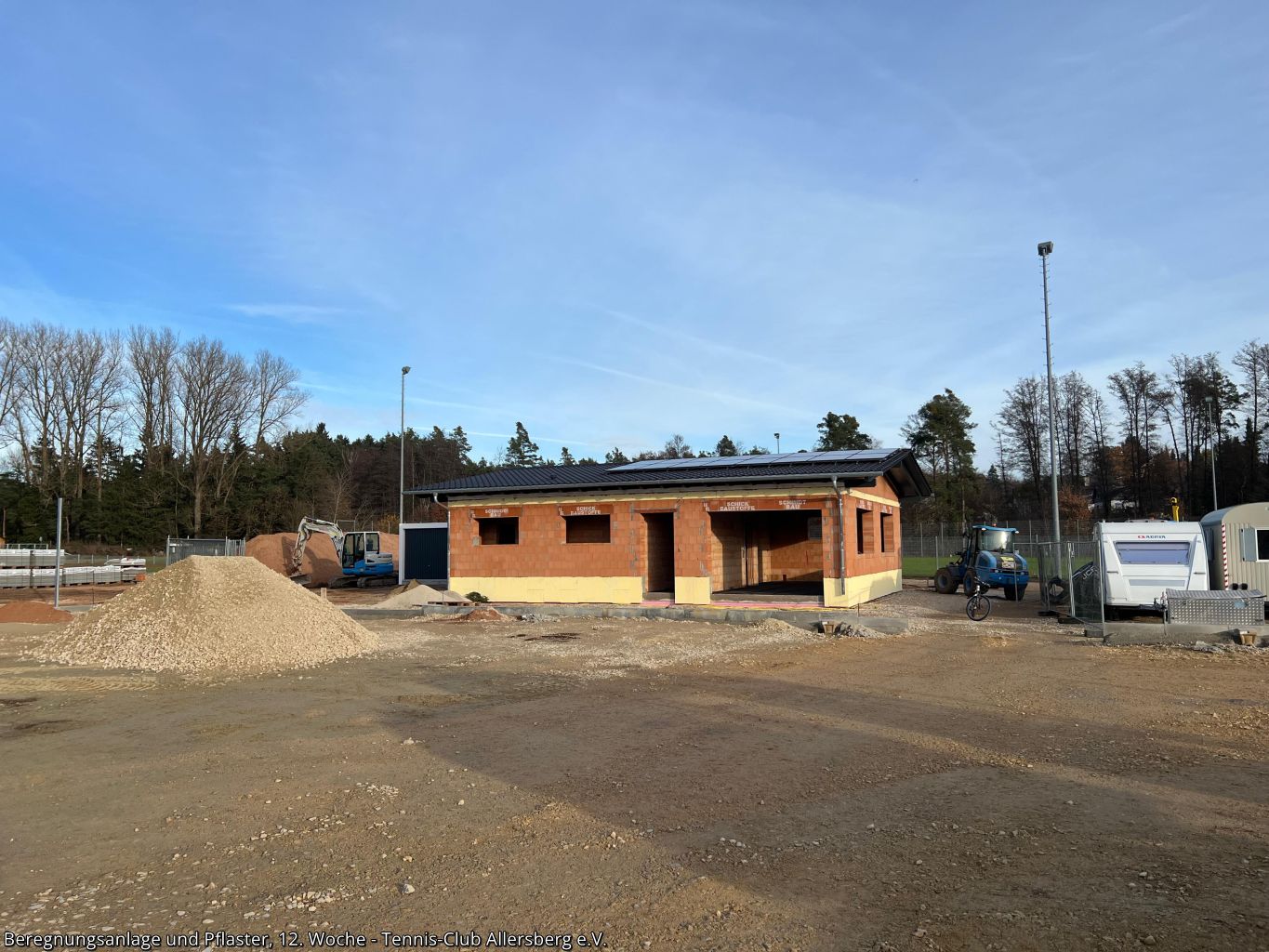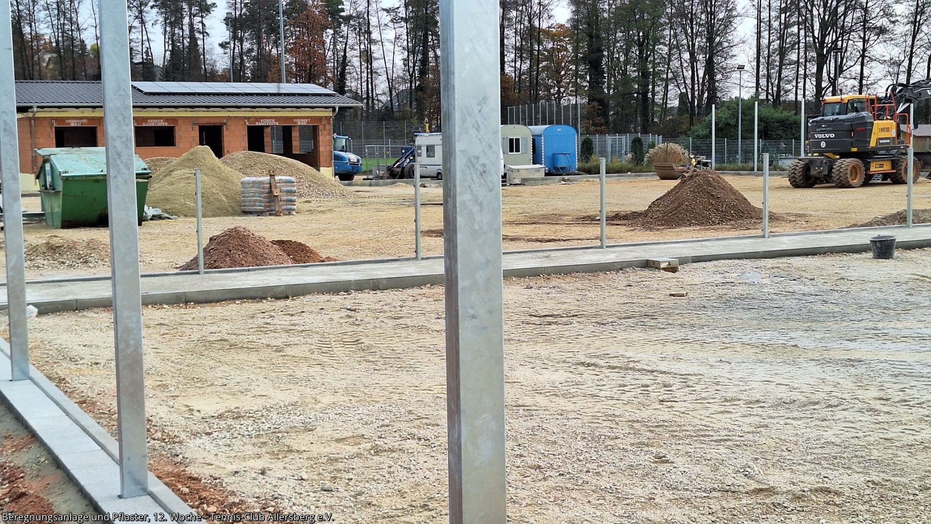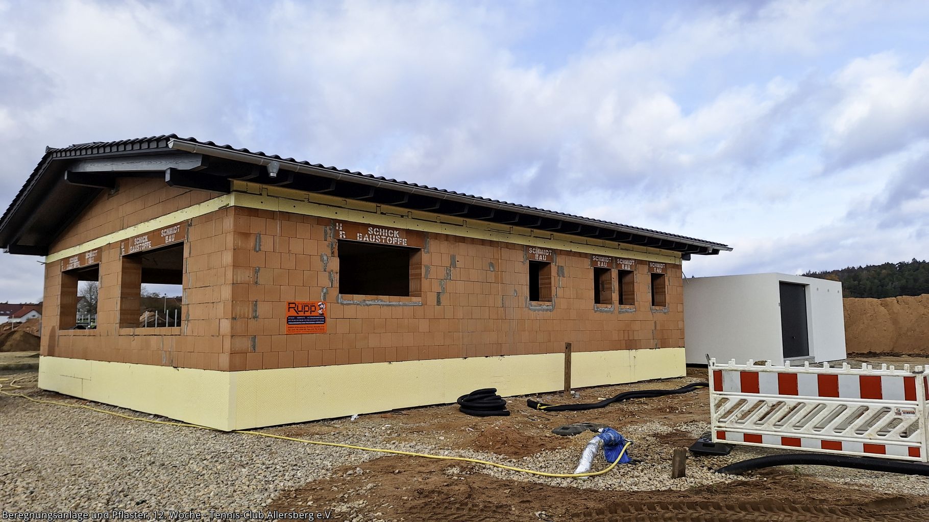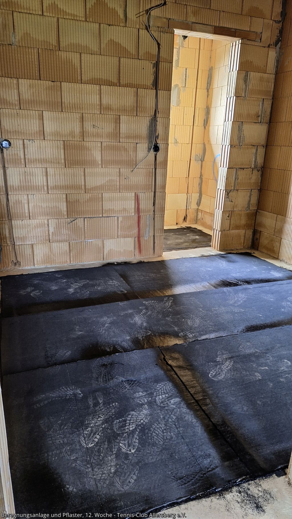 Im Laufe dieser Woche wurde die Beregnungsanlage auf den Plätzen 3 und 4 weitergebaut, parallel wurden die Kantensteine auf Platz 1 und 2 und vor der Terasse gesetzt, sodass hier in der nächsten Woche auch die Beregnungsanlage eingebaut werden kann. Der Zwischengang zwischen Platz 2 und 3 wurden bereits gepflastert und auch im Haus geht es voran, die Schweißbahnen sind verlegt, sodass alles für den Einbau der Fenster in der kommenden Woche vorbereitet ist.