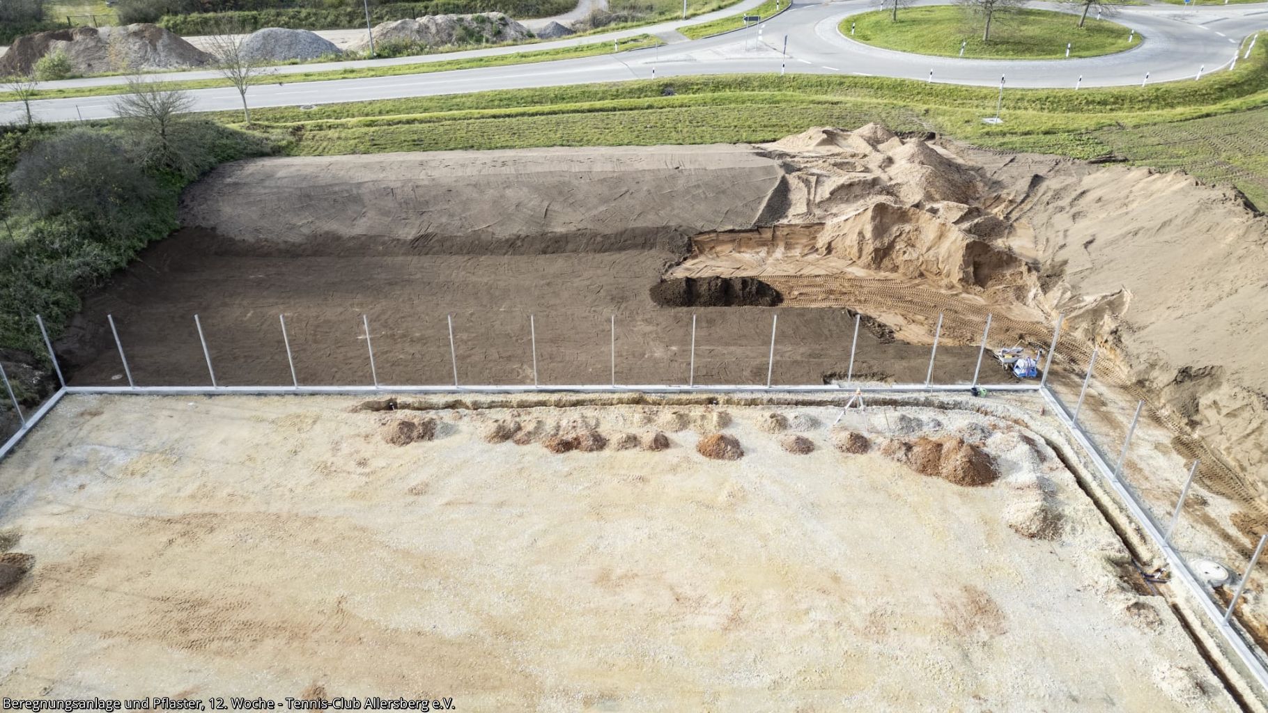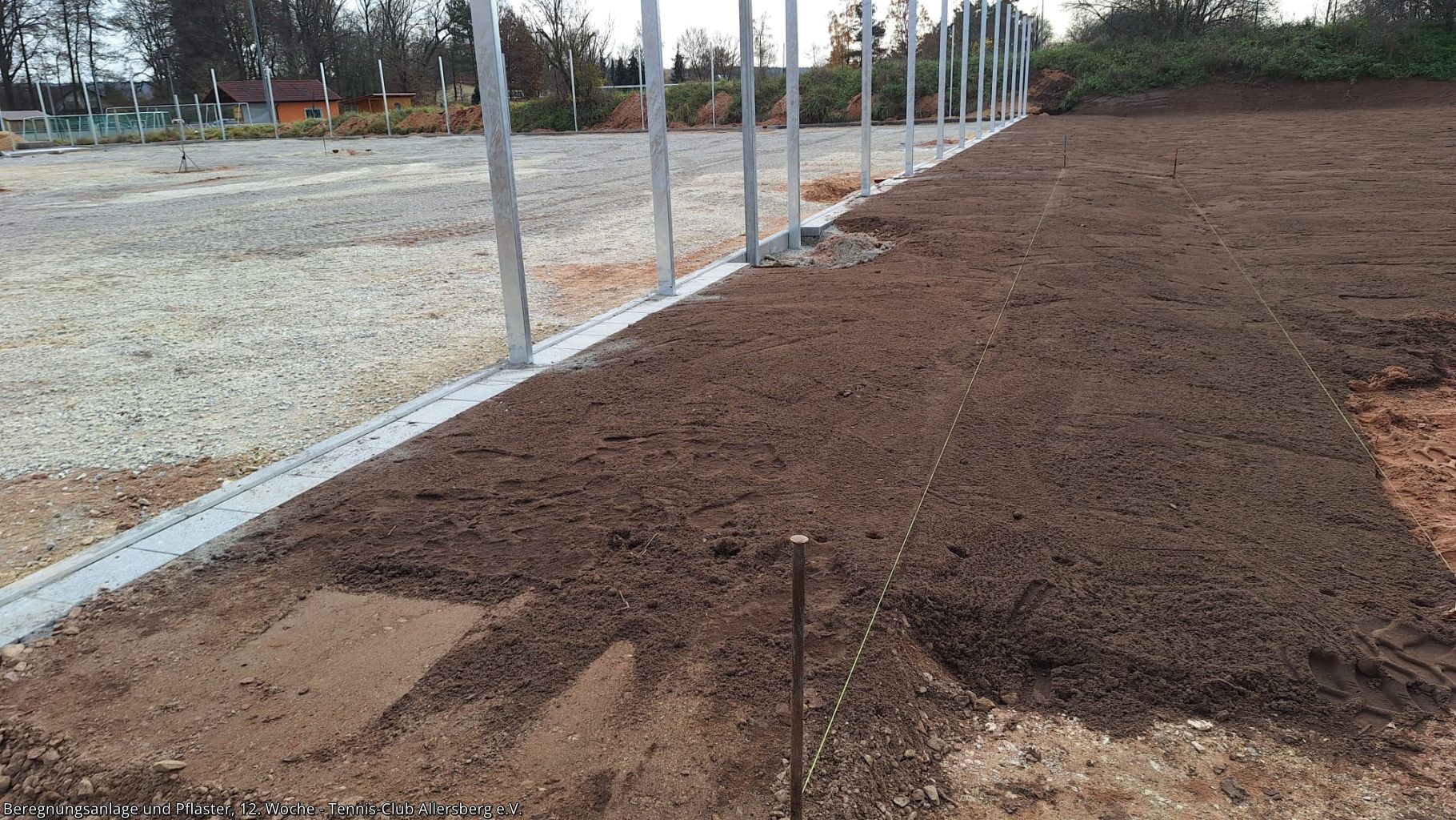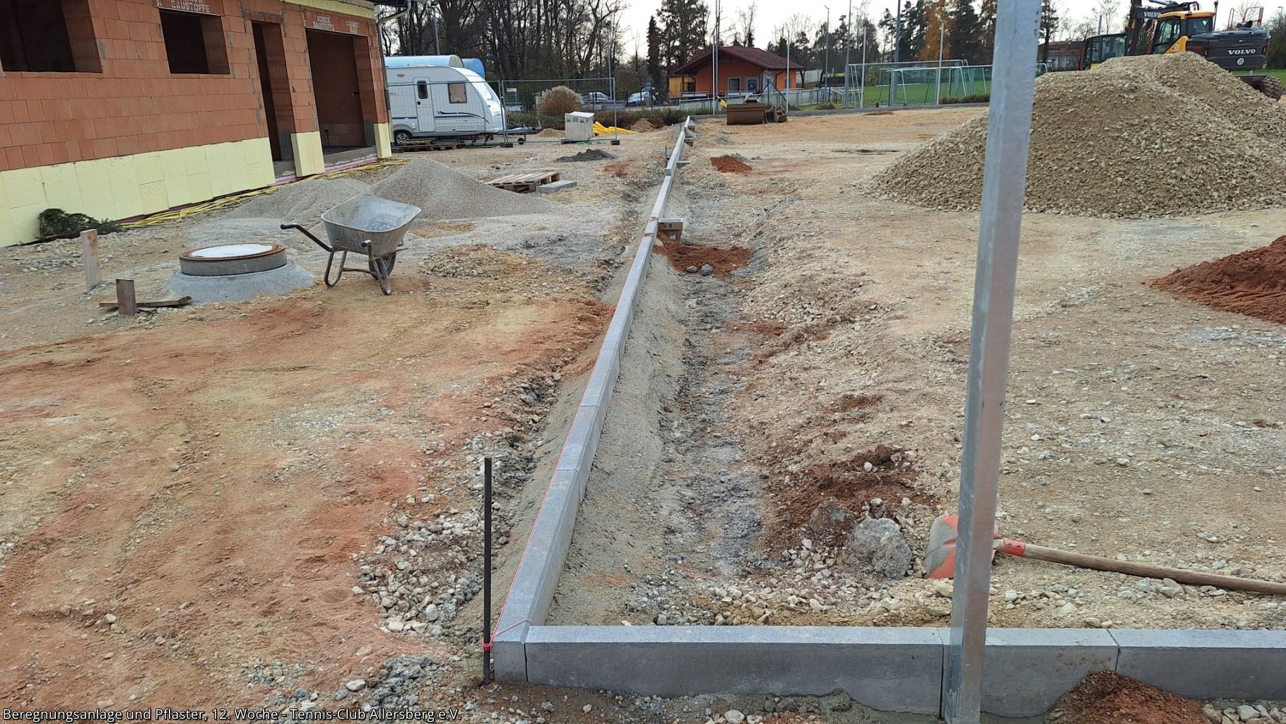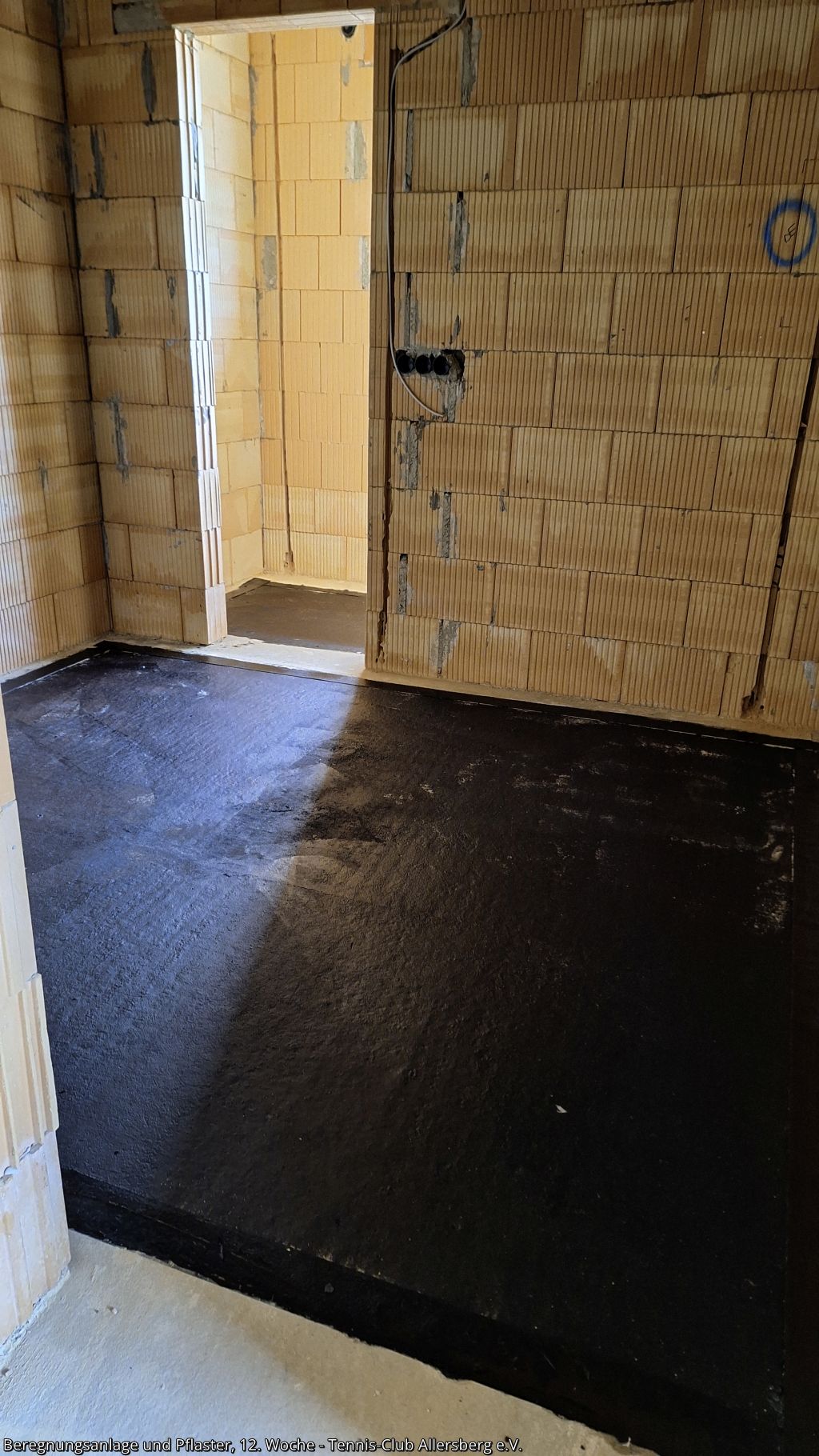 Im Laufe dieser Woche wurde die Beregnungsanlage auf den Plätzen 3 und 4 weitergebaut, parallel wurden die Kantensteine auf Platz 1 und 2 und vor der Terasse gesetzt, sodass hier in der nächsten Woche auch die Beregnungsanlage eingebaut werden kann. Der Zwischengang zwischen Platz 2 und 3 wurden bereits gepflastert und auch im Haus geht es voran, die Schweißbahnen sind verlegt, sodass alles für den Einbau der Fenster in der kommenden Woche vorbereitet ist.
