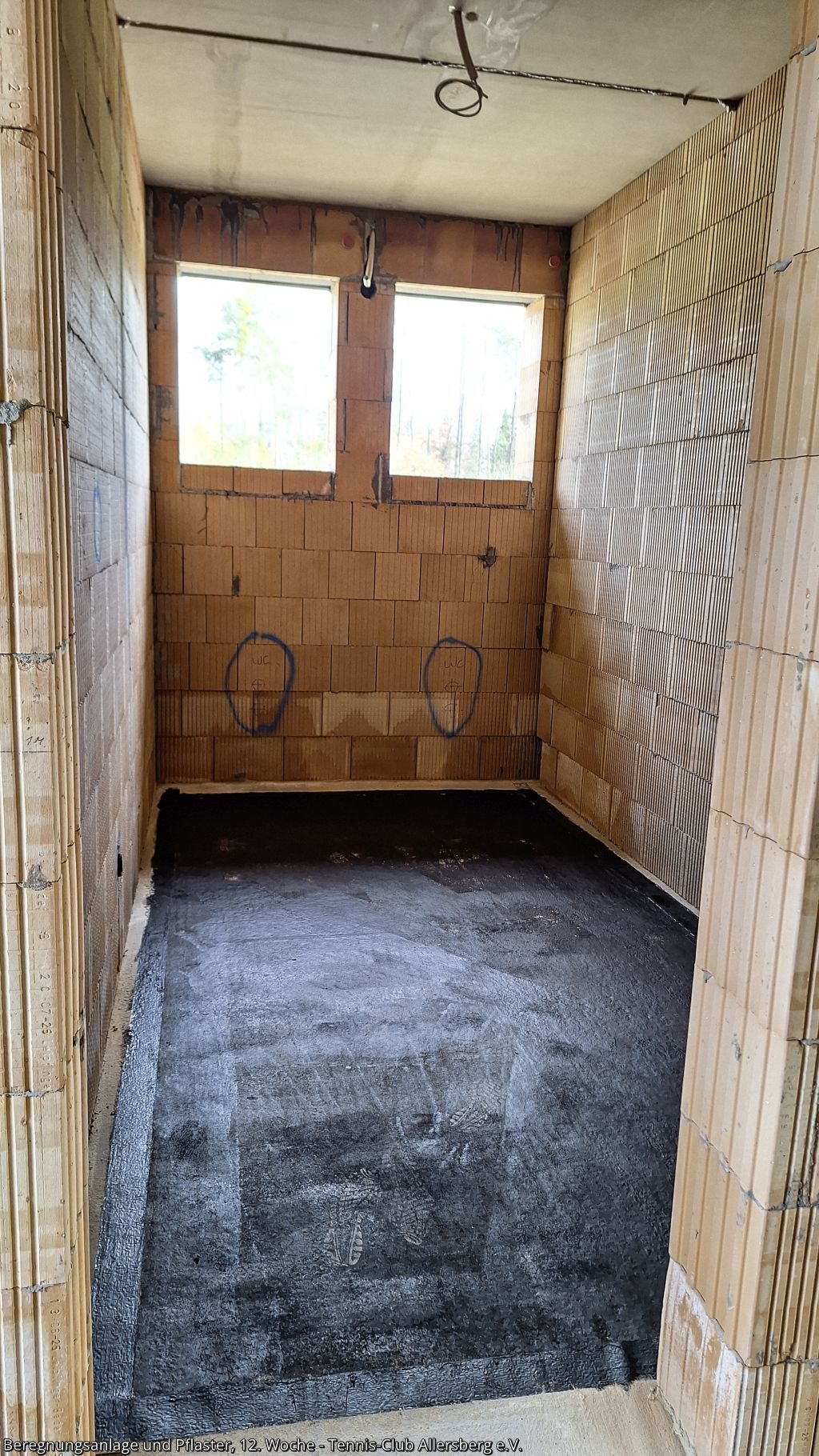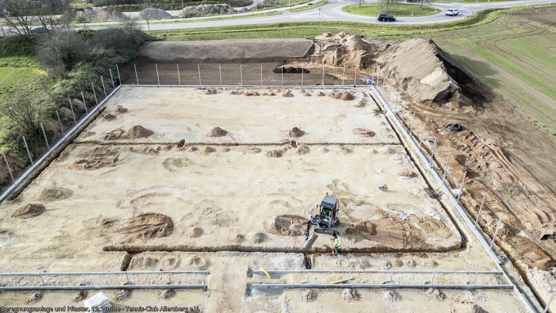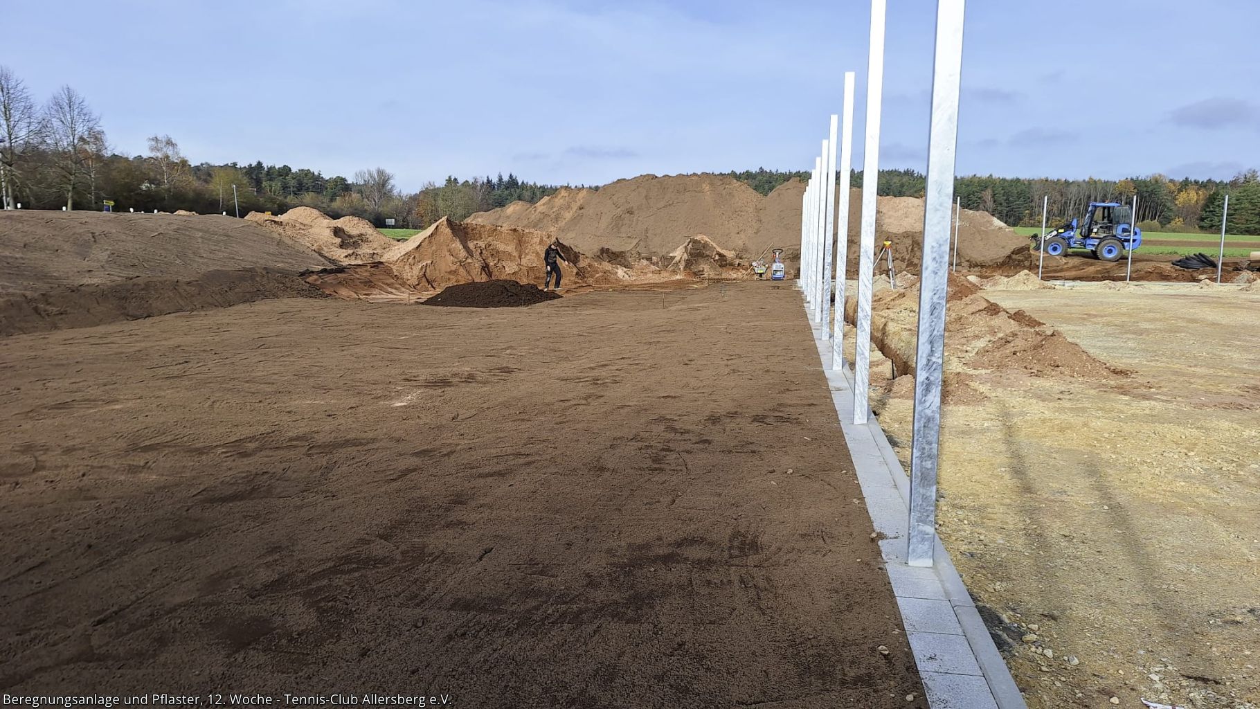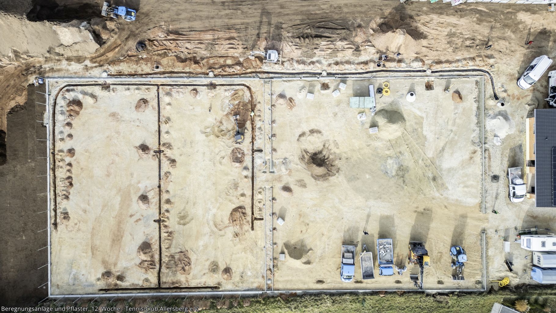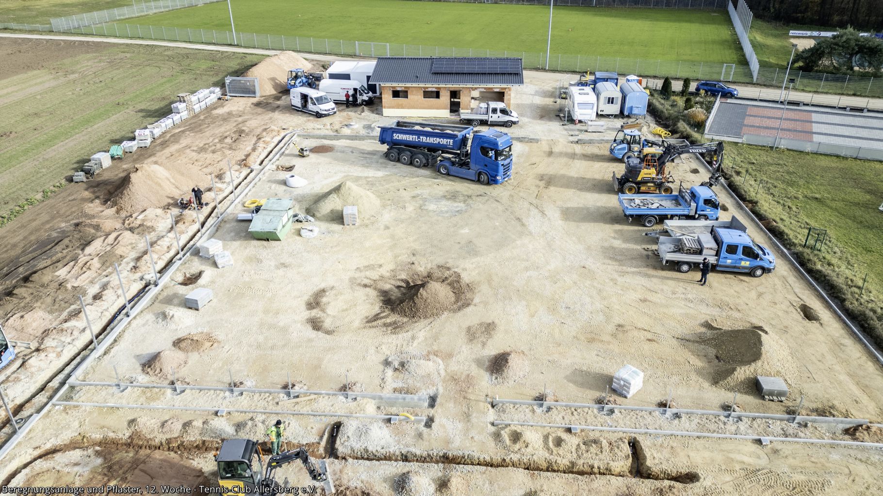 Im Laufe dieser Woche wurde die Beregnungsanlage auf den Plätzen 3 und 4 weitergebaut, parallel wurden die Kantensteine auf Platz 1 und 2 und vor der Terasse gesetzt, sodass hier in der nächsten Woche auch die Beregnungsanlage eingebaut werden kann. Der Zwischengang zwischen Platz 2 und 3 wurden bereits gepflastert und auch im Haus geht es voran, die Schweißbahnen sind verlegt, sodass alles für den Einbau der Fenster in der kommenden Woche vorbereitet ist.
