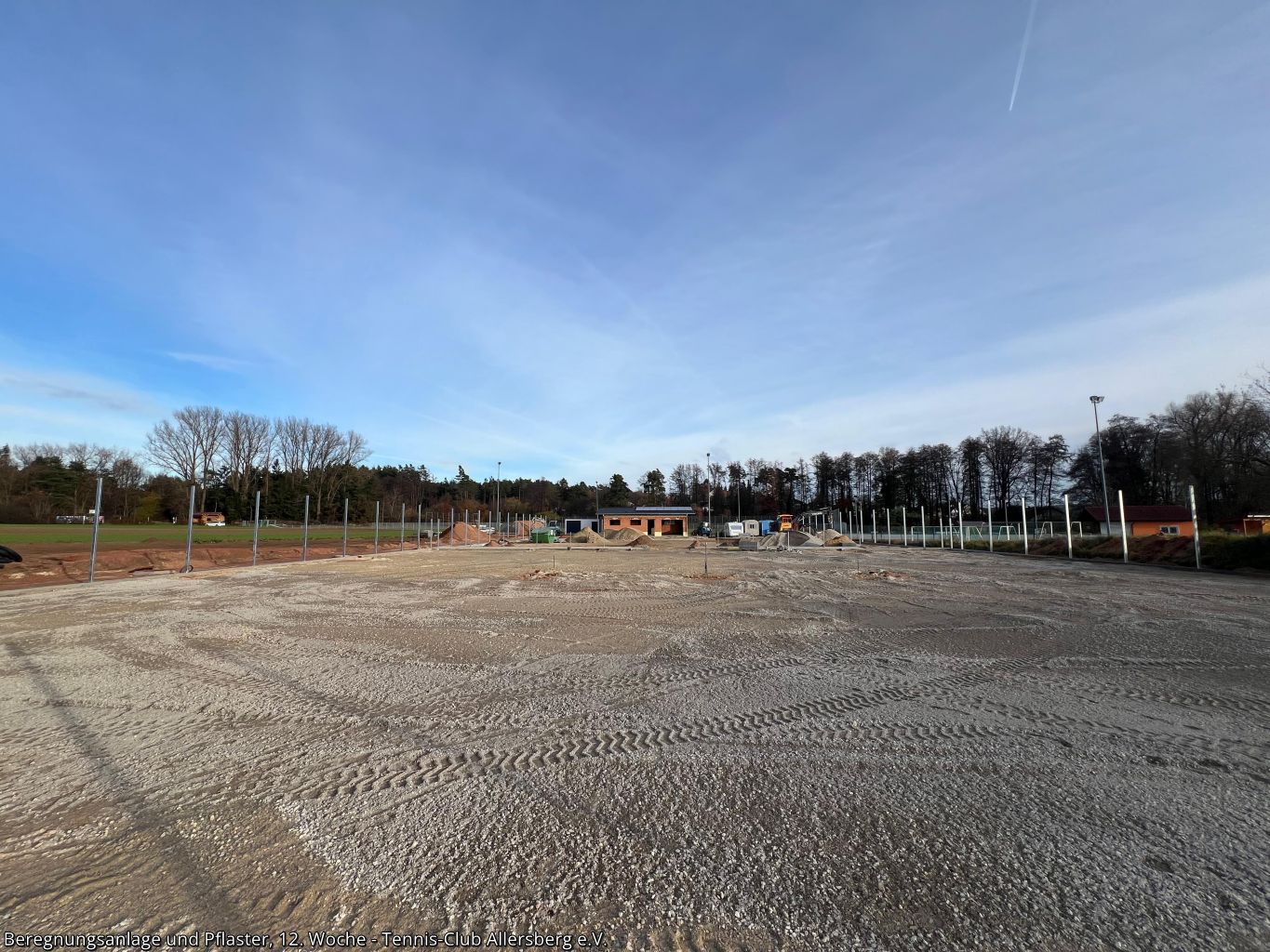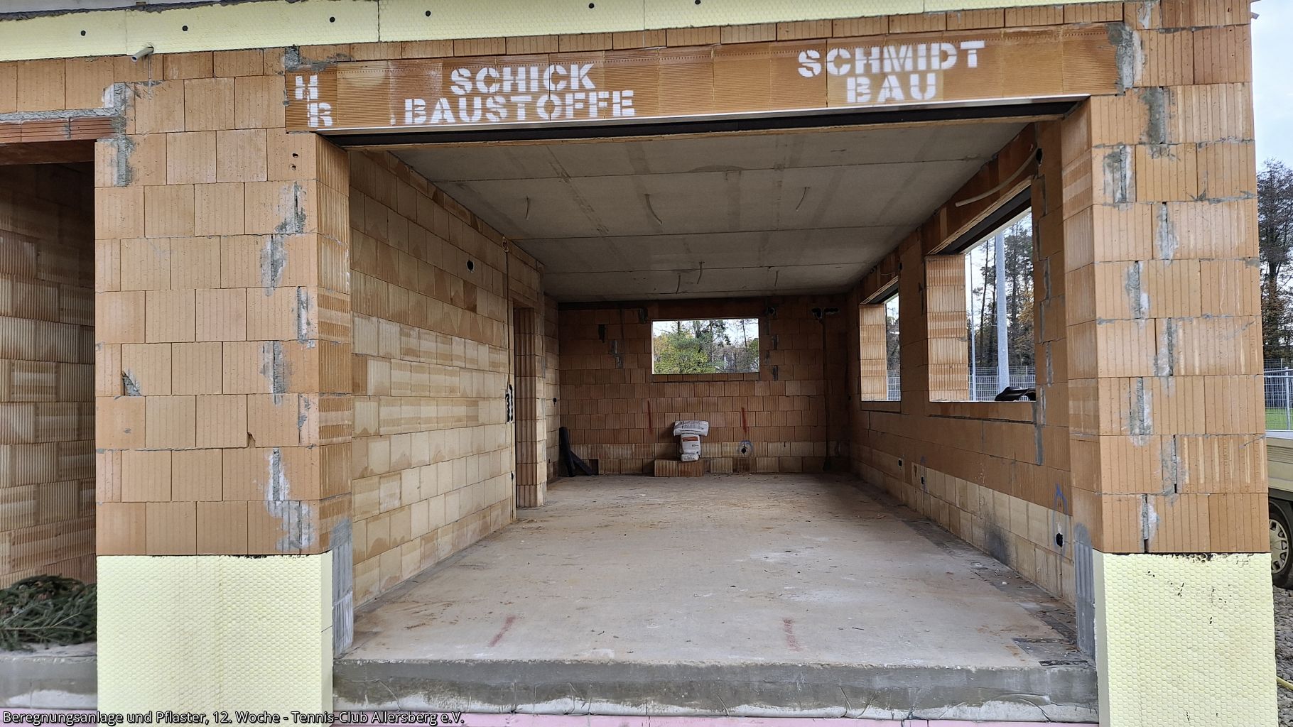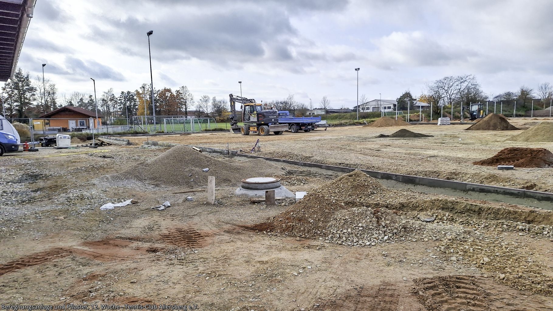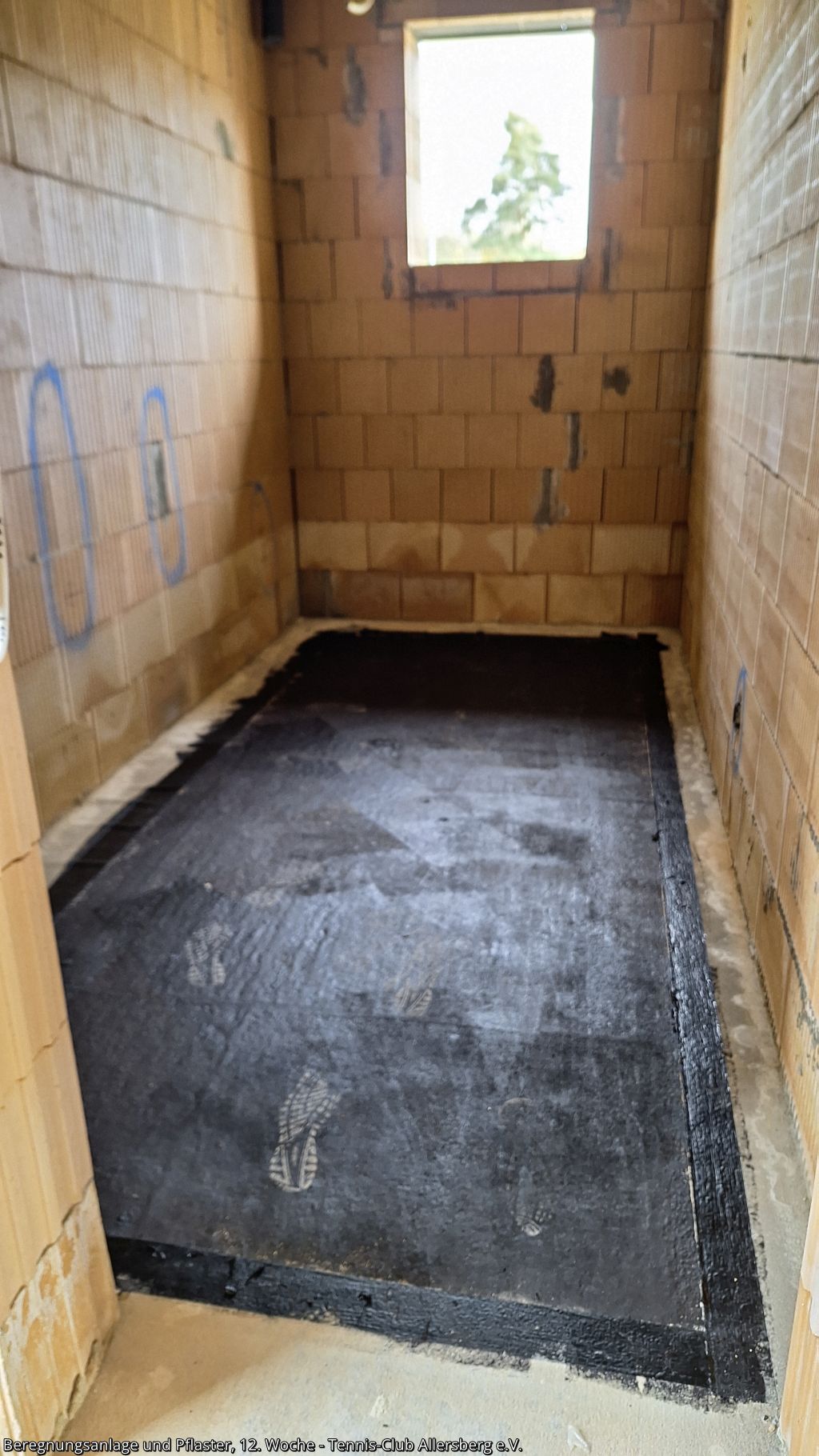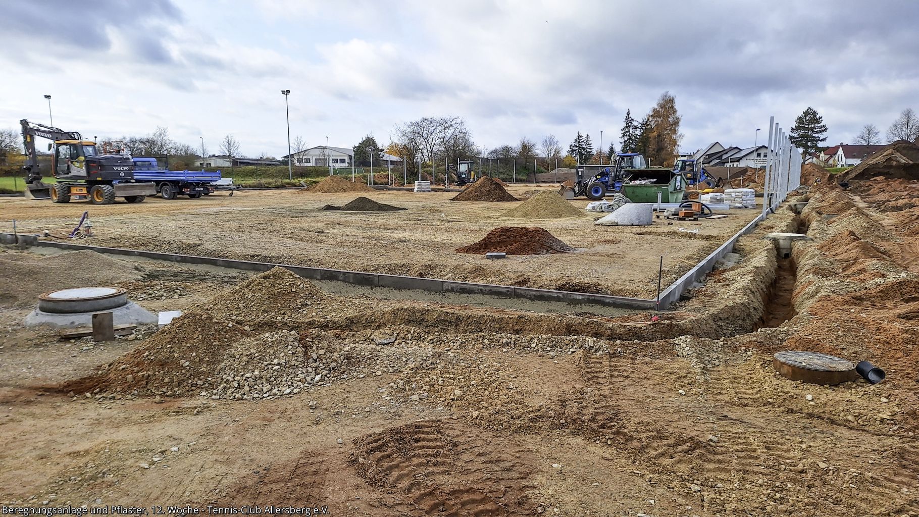 Im Laufe dieser Woche wurde die Beregnungsanlage auf den Plätzen 3 und 4 weitergebaut, parallel wurden die Kantensteine auf Platz 1 und 2 und vor der Terasse gesetzt, sodass hier in der nächsten Woche auch die Beregnungsanlage eingebaut werden kann. Der Zwischengang zwischen Platz 2 und 3 wurden bereits gepflastert und auch im Haus geht es voran, die Schweißbahnen sind verlegt, sodass alles für den Einbau der Fenster in der kommenden Woche vorbereitet ist.