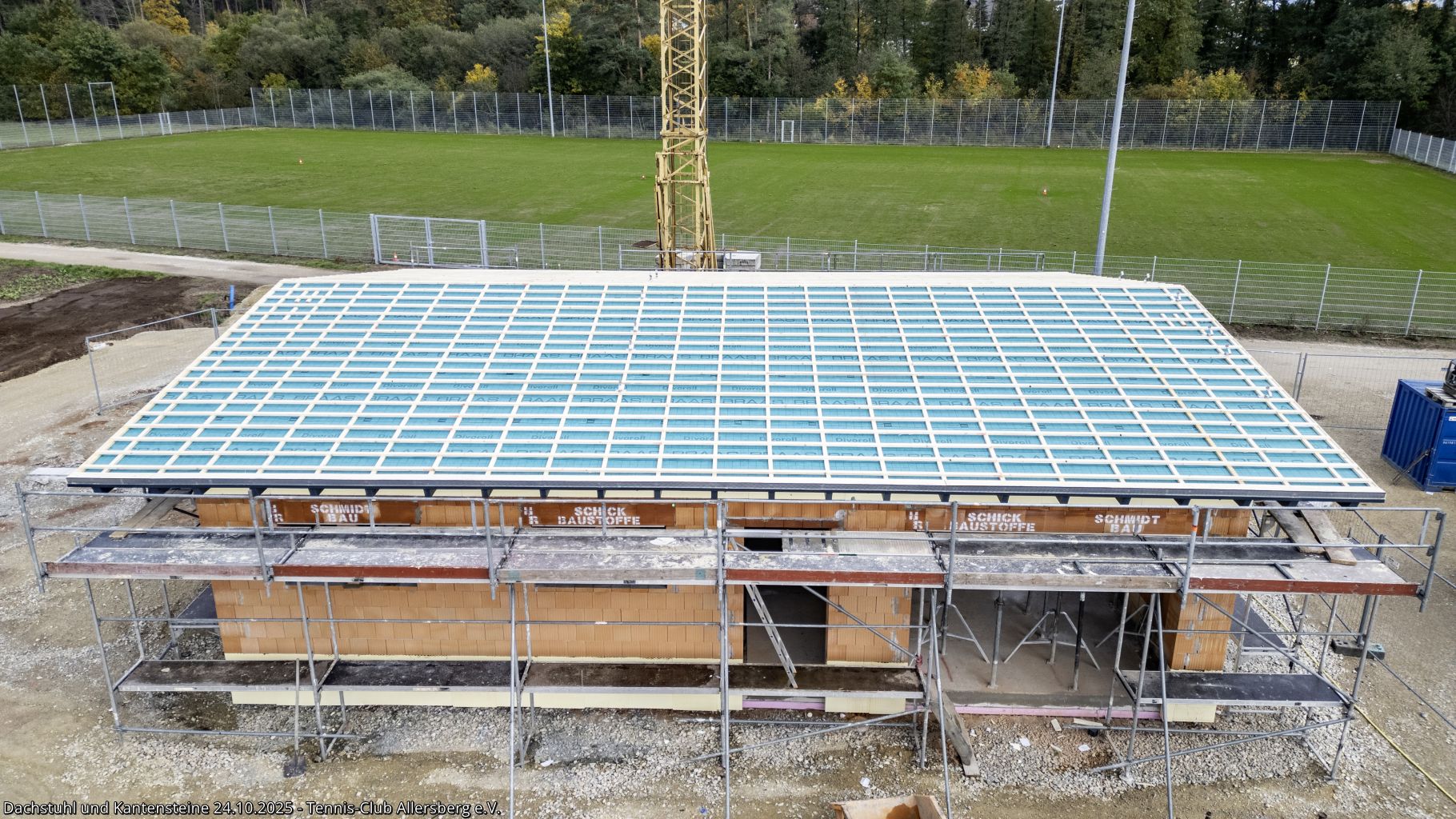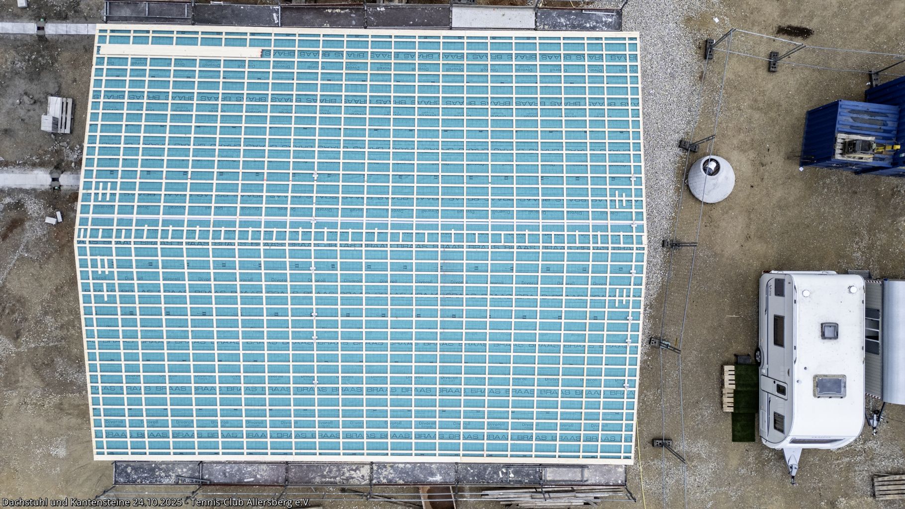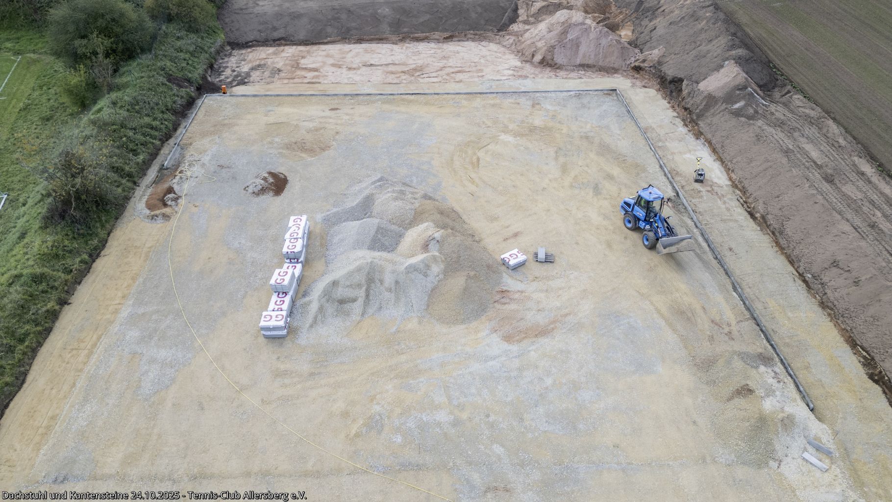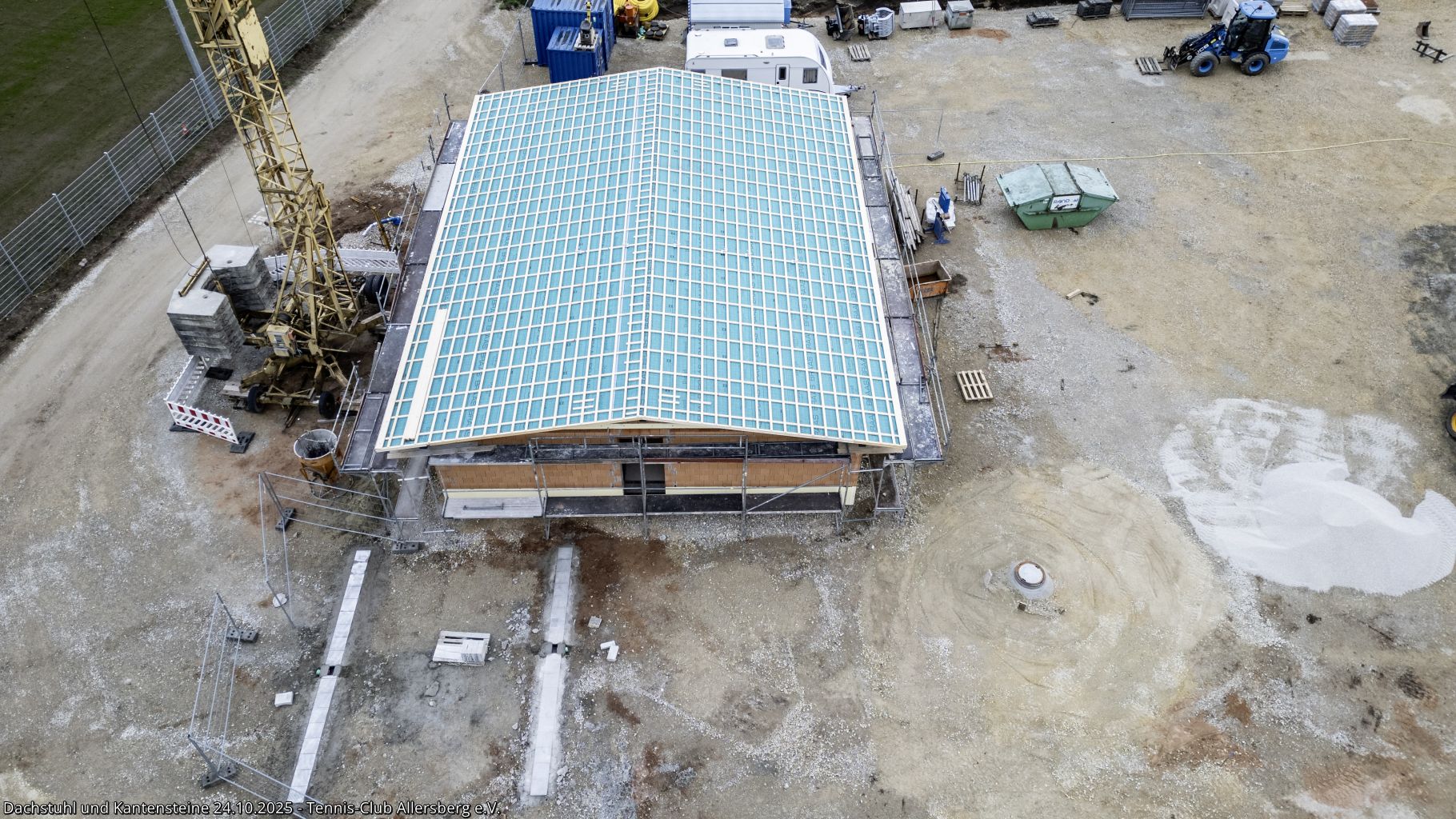 In der KW 43 wurde das Dacht dicht gemacht und somit für das Dachdecken am 25.10.2025 vorbereitet. Auch auf den Plätzen ging es voran, die Kantensteine zeigen nun schon deutlich Platz 3 und 4, weiterhin wurde die Zisterne fertiggestellt und es fanden Abstimmungen zu den nächsten Schritten statt, insbesondere auch zur Beregnungsanlage für die die Arbeiten in Kürze starten.