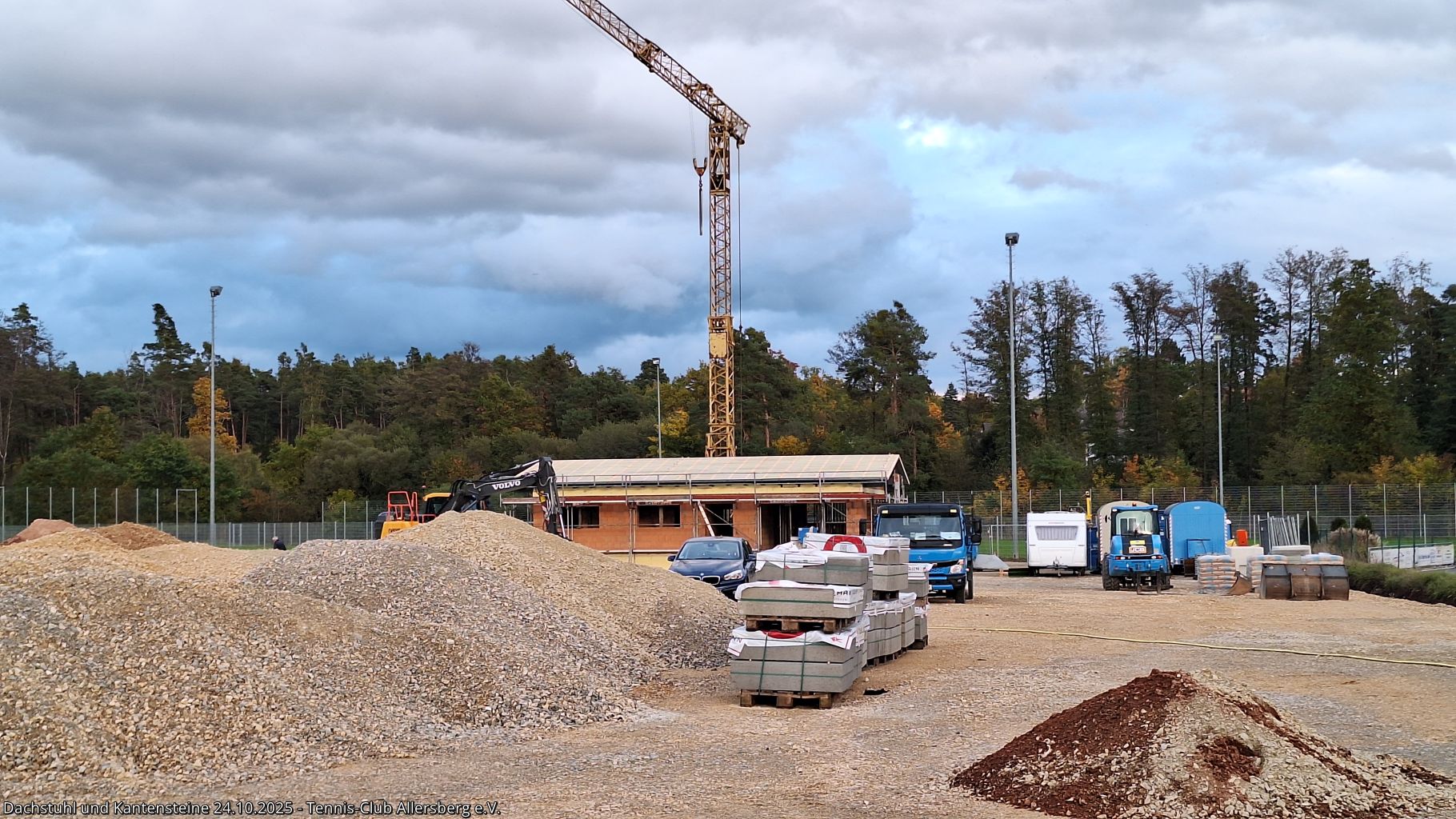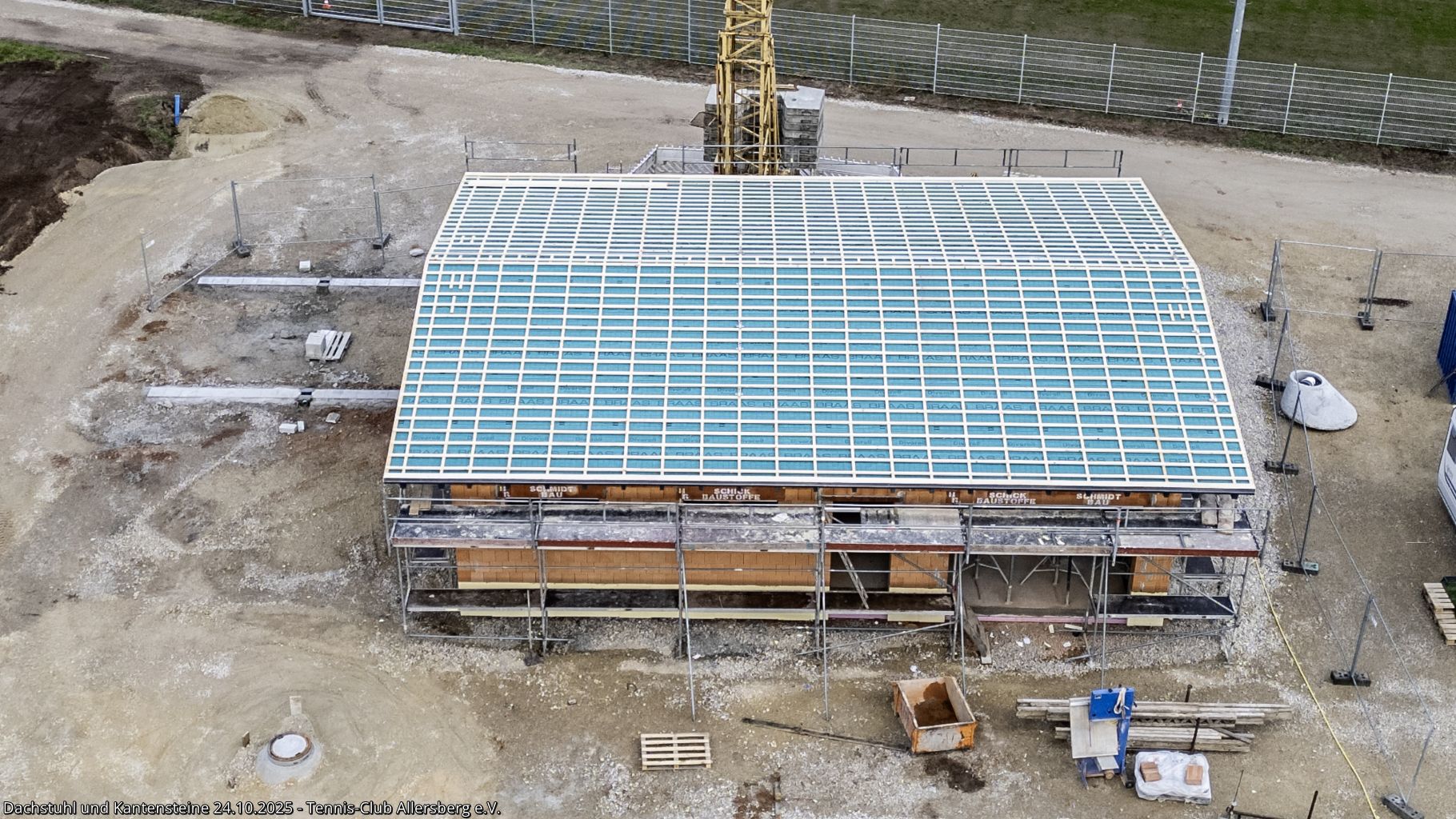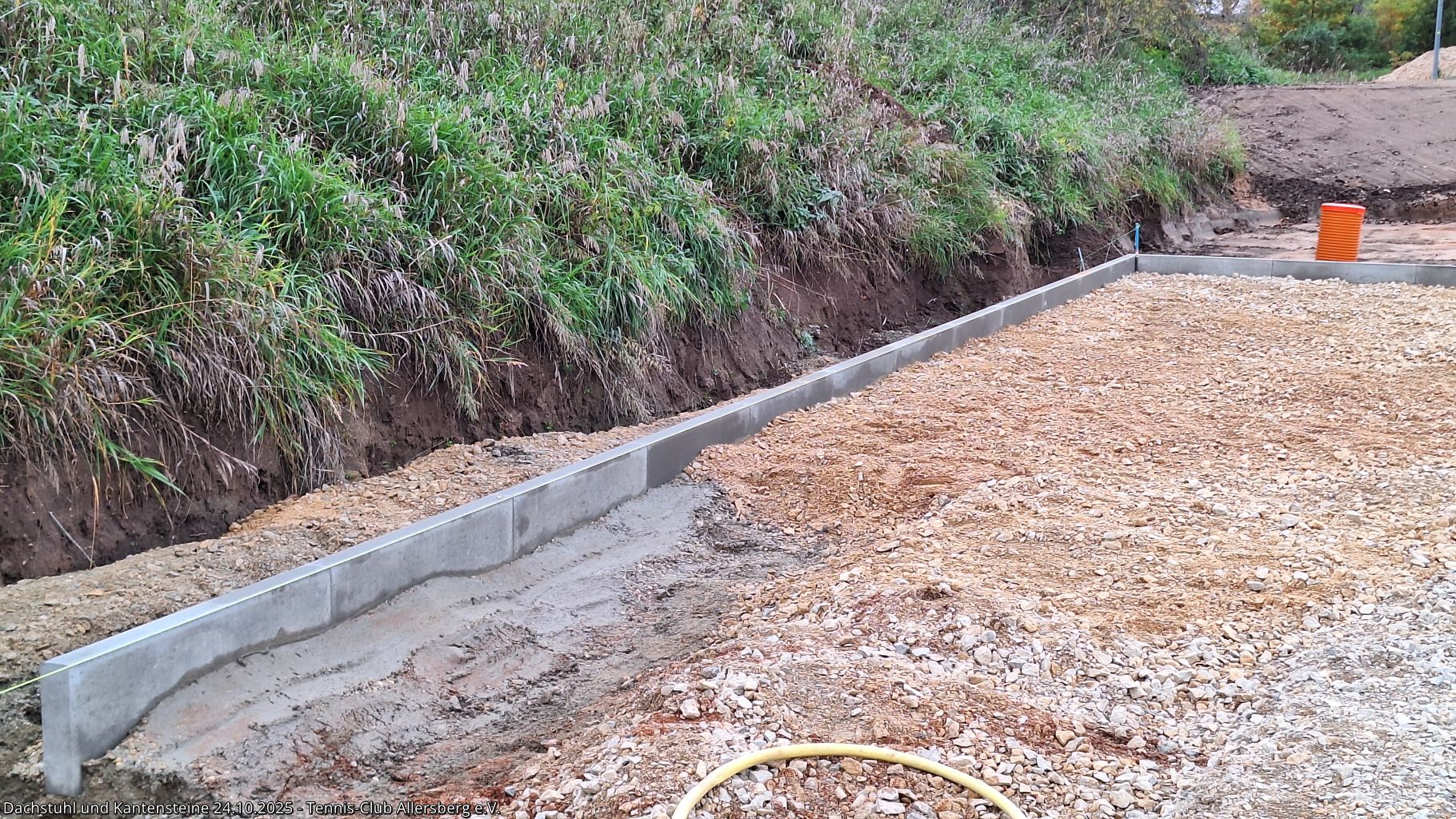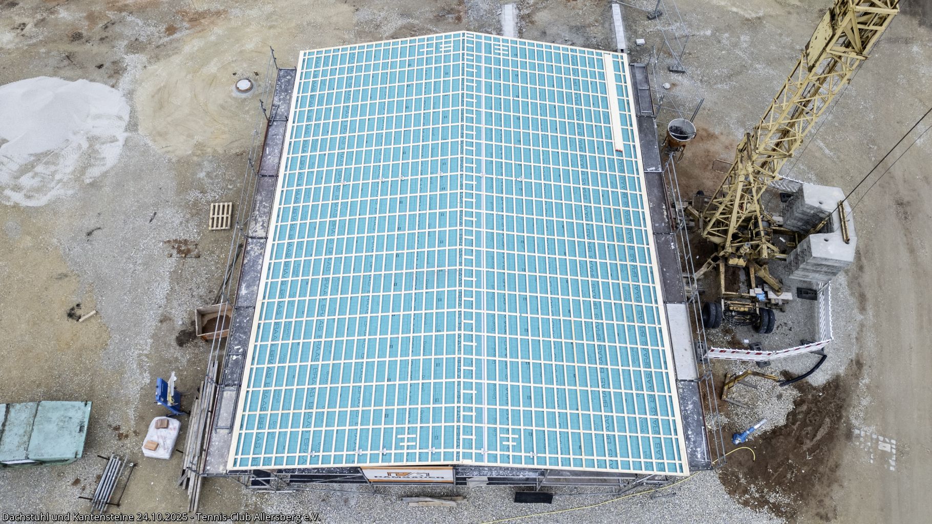 In der KW 43 wurde das Dacht dicht gemacht und somit für das Dachdecken am 25.10.2025 vorbereitet. Auch auf den Plätzen ging es voran, die Kantensteine zeigen nun schon deutlich Platz 3 und 4, weiterhin wurde die Zisterne fertiggestellt und es fanden Abstimmungen zu den nächsten Schritten statt, insbesondere auch zur Beregnungsanlage für die die Arbeiten in Kürze starten.