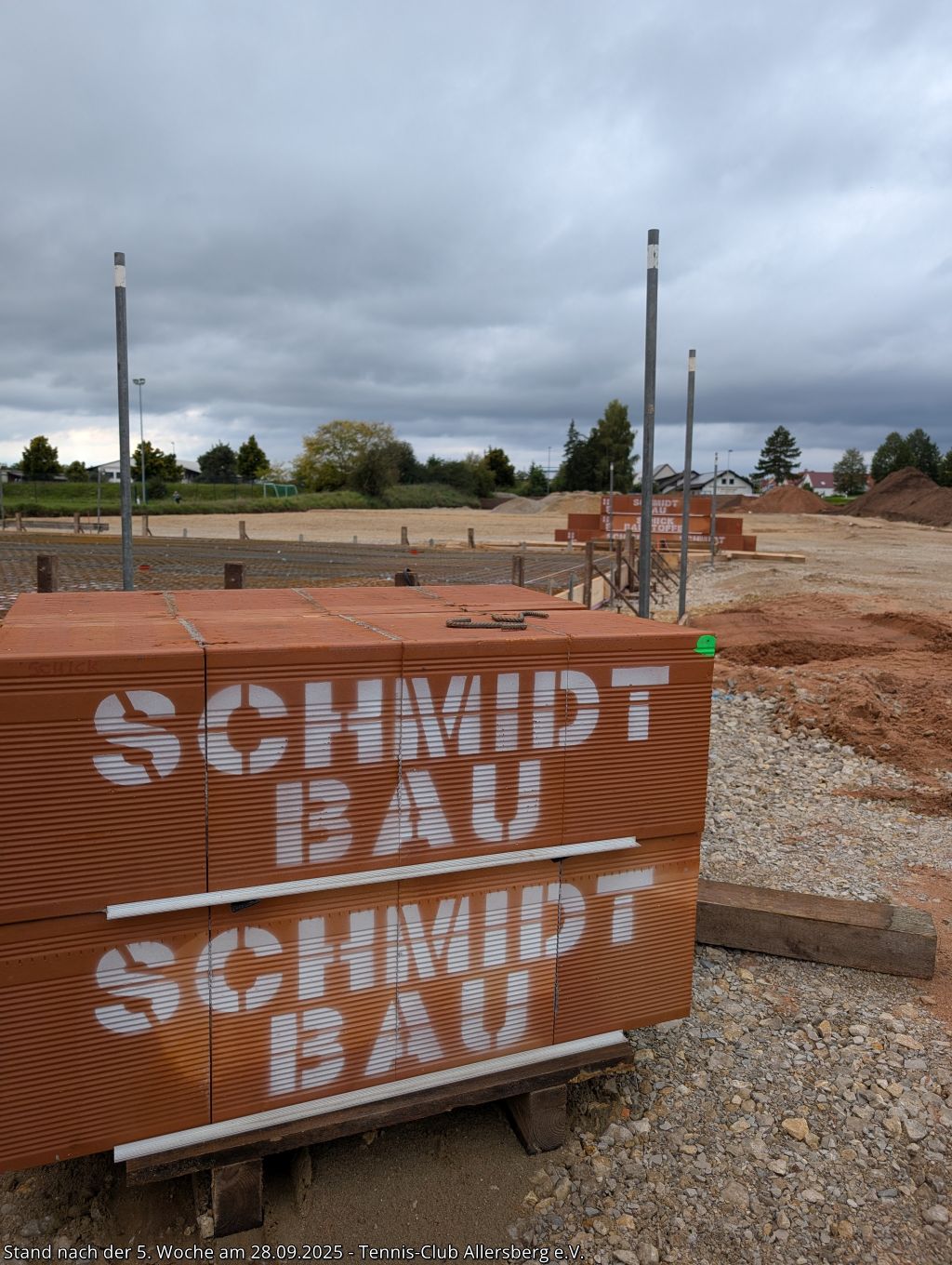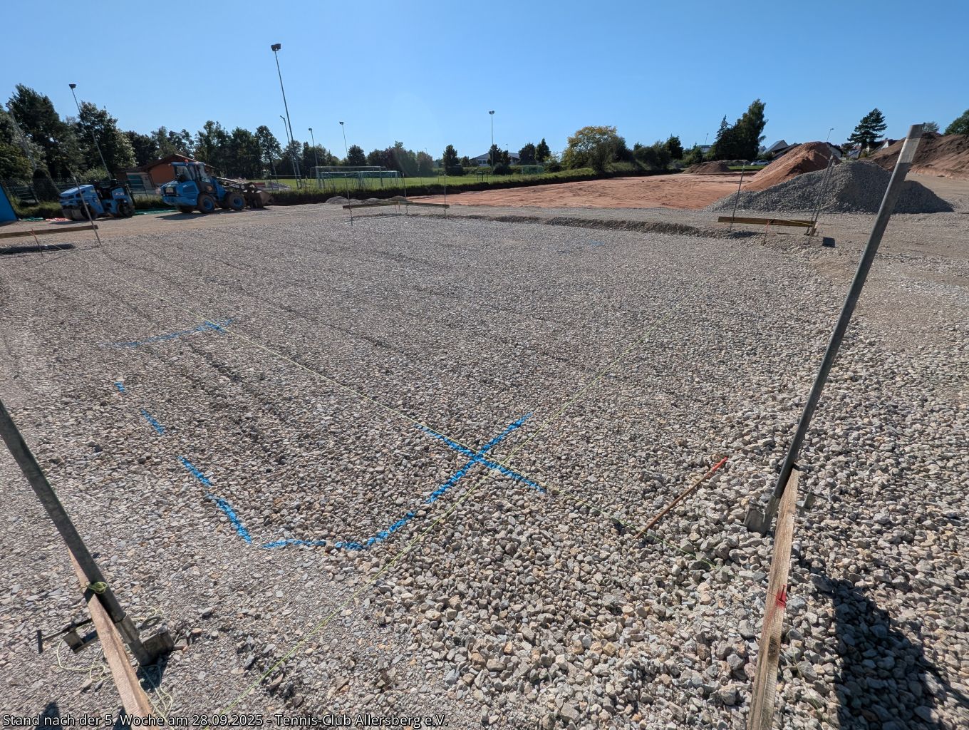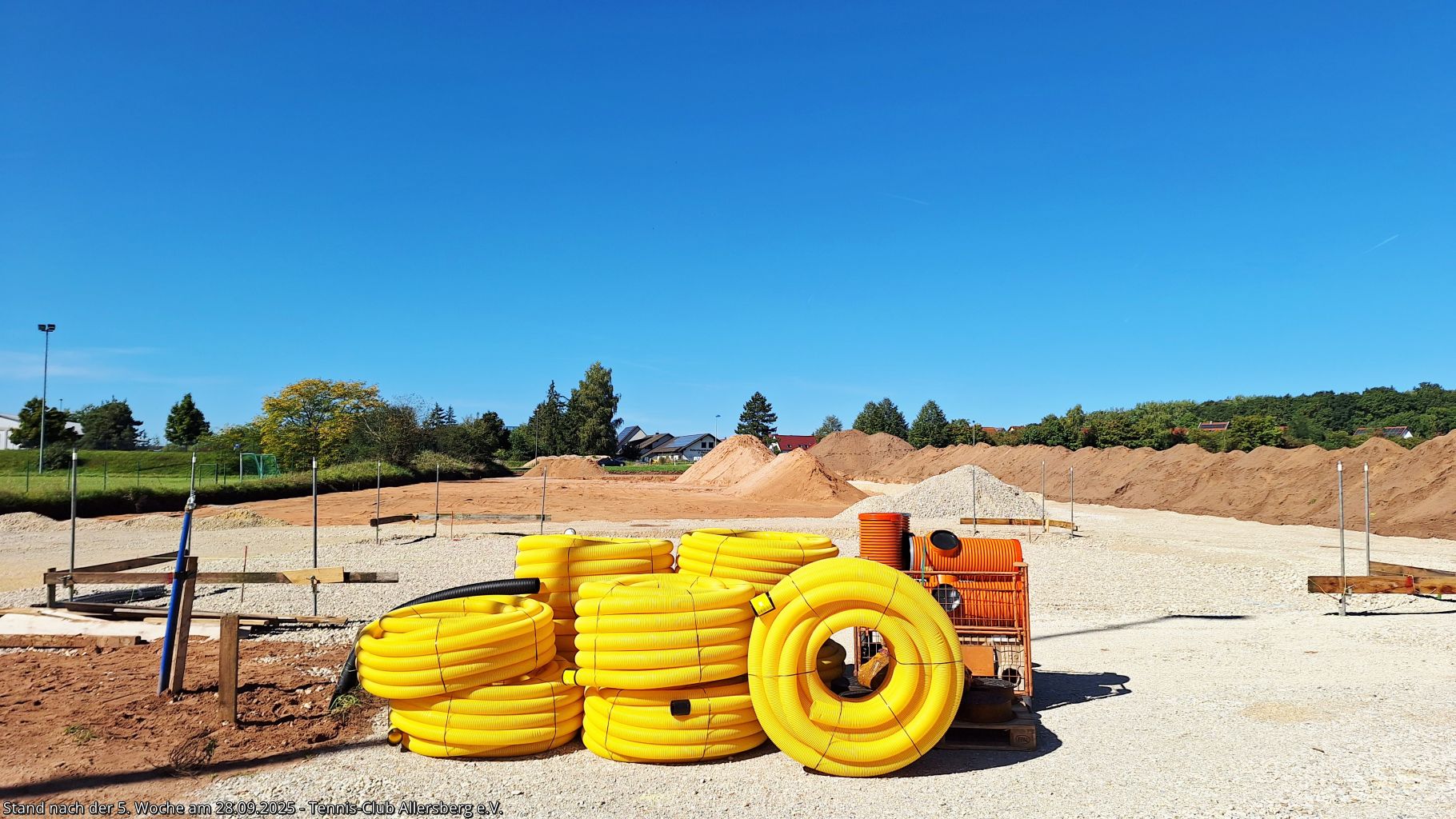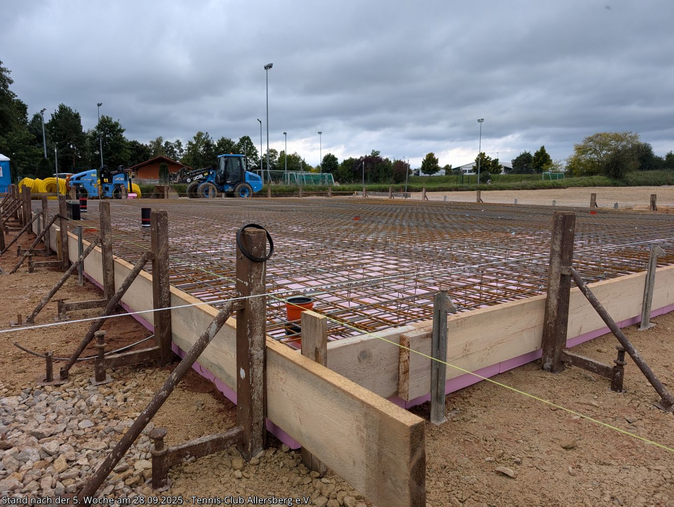 Seit unserem Spatenstich ist einiges passiert, ein Teil des überschüssigen Oberbodens wurde abtransportiert, der Unterbau der Plätze wurde vorbereitet, der Kanalanschluss für das Vereinsheim wurde erstellt, der Kran aufgestellt, sowie die Schalung für die Bodenplatte vorbereitet. Damit steht dem Gießen der Bodenplatte nichts mehr im Wege, auch das Mauern der Außenmauern wird im Laufe der folgenden Woche starten, ehe es auf den Sportplätzen weiter geht.