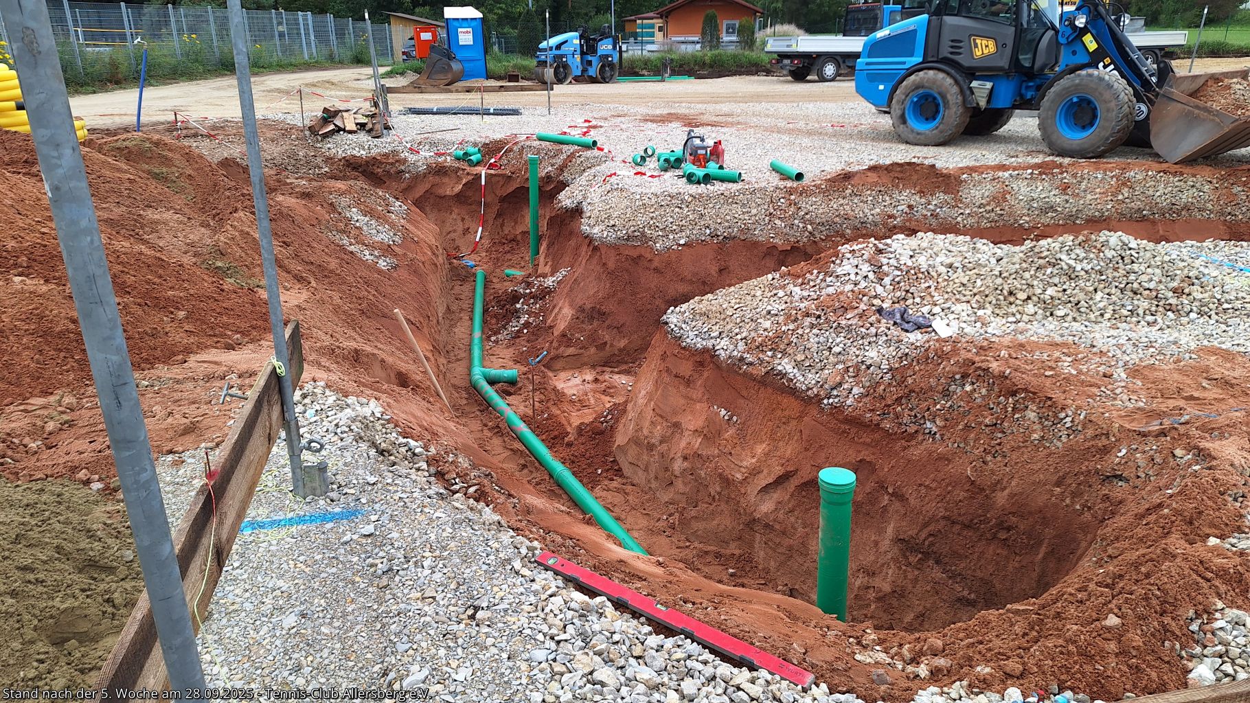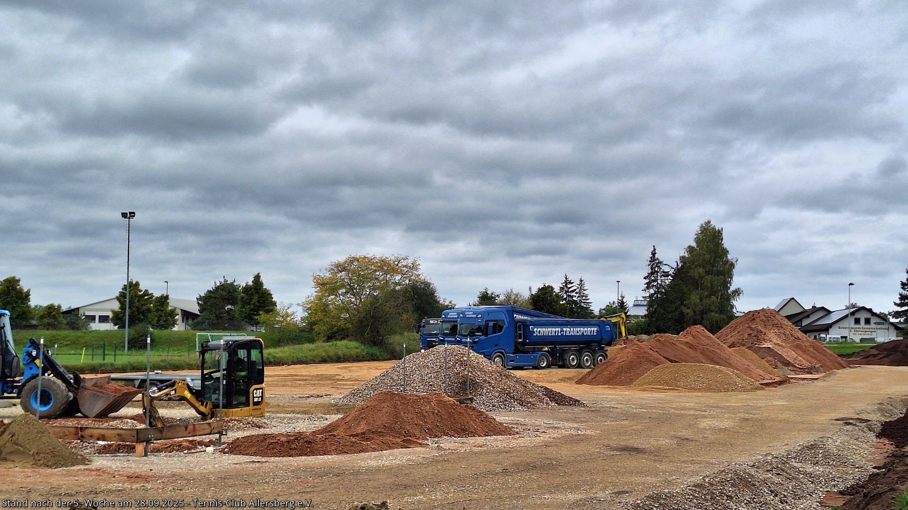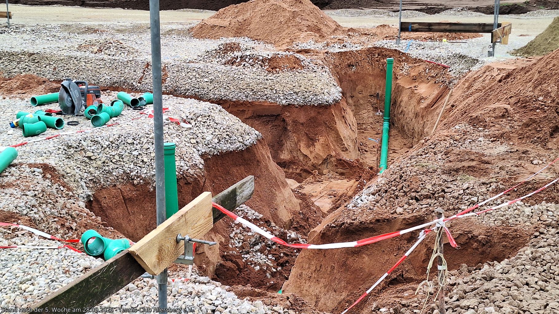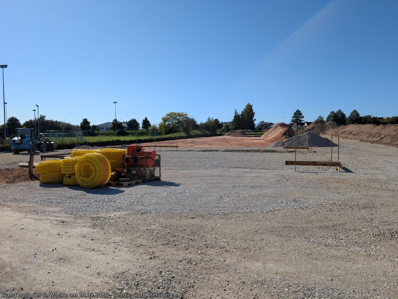 Seit unserem Spatenstich ist einiges passiert, ein Teil des überschüssigen Oberbodens wurde abtransportiert, der Unterbau der Plätze wurde vorbereitet, der Kanalanschluss für das Vereinsheim wurde erstellt, der Kran aufgestellt, sowie die Schalung für die Bodenplatte vorbereitet. Damit steht dem Gießen der Bodenplatte nichts mehr im Wege, auch das Mauern der Außenmauern wird im Laufe der folgenden Woche starten, ehe es auf den Sportplätzen weiter geht.