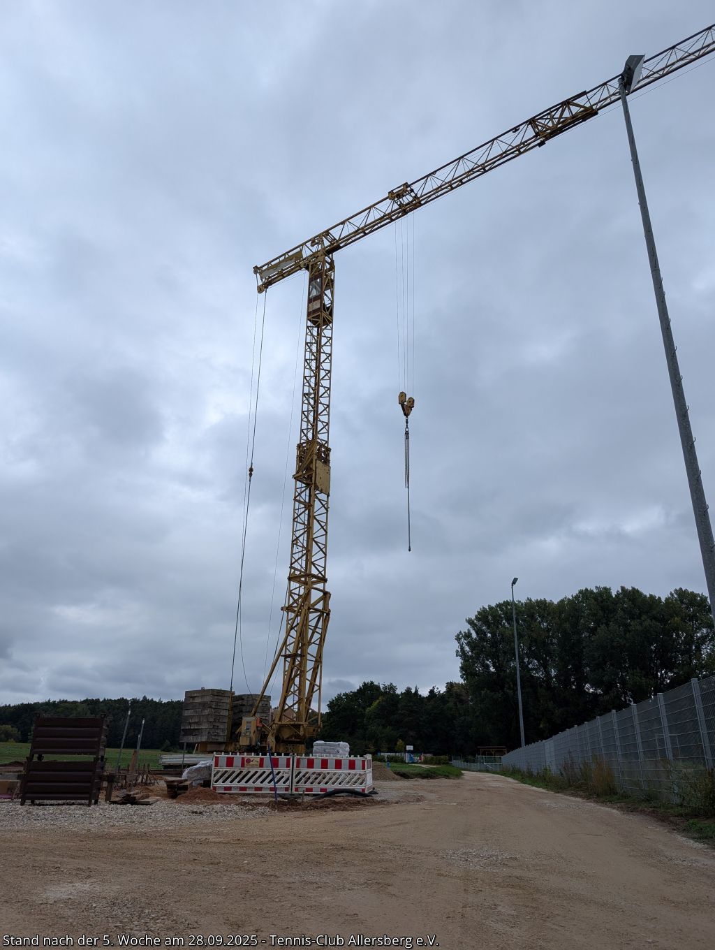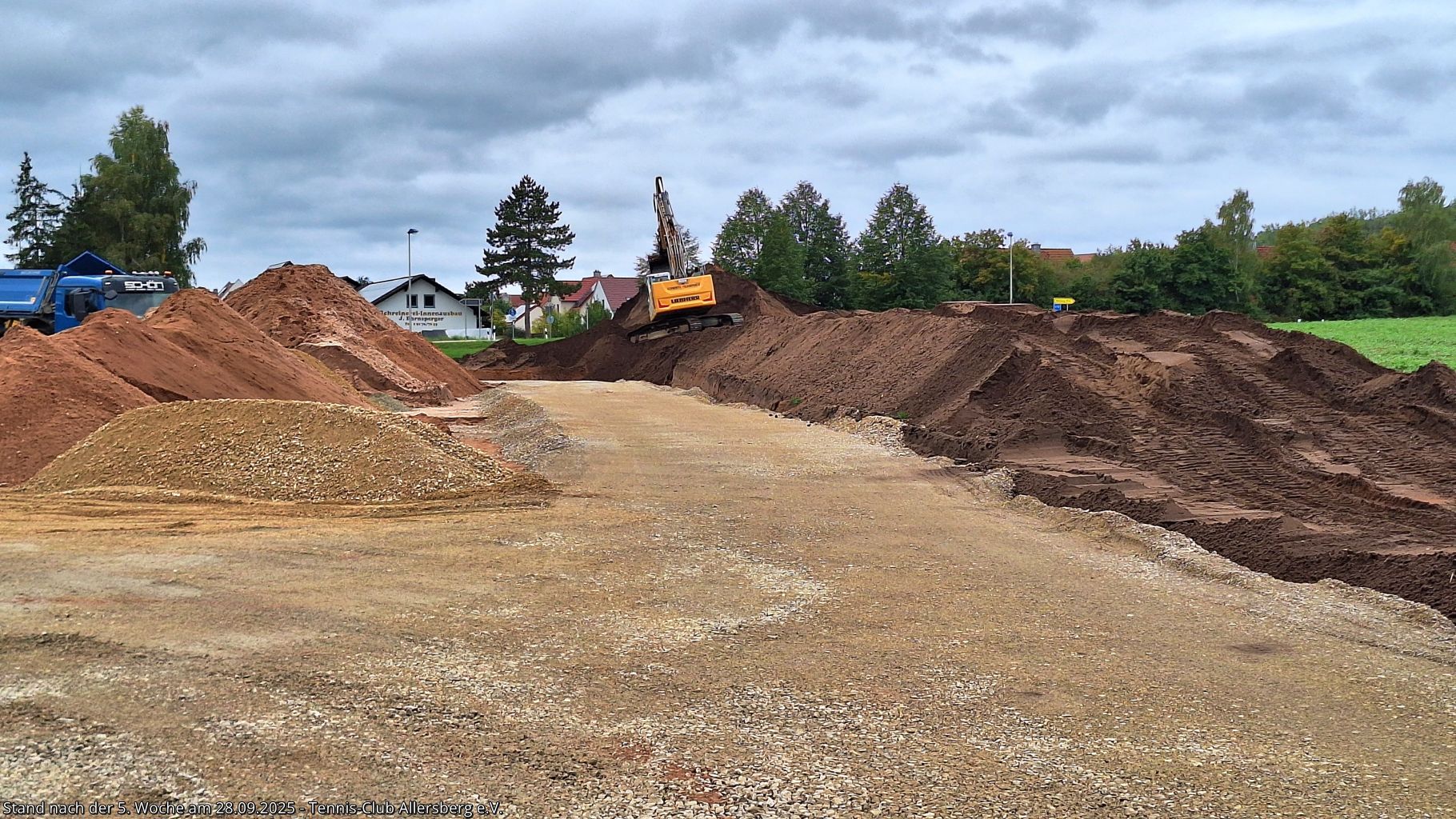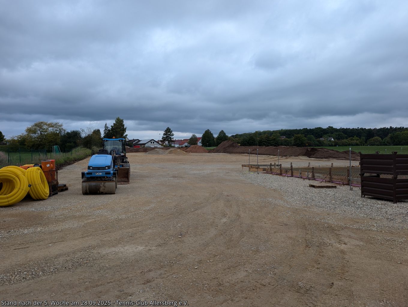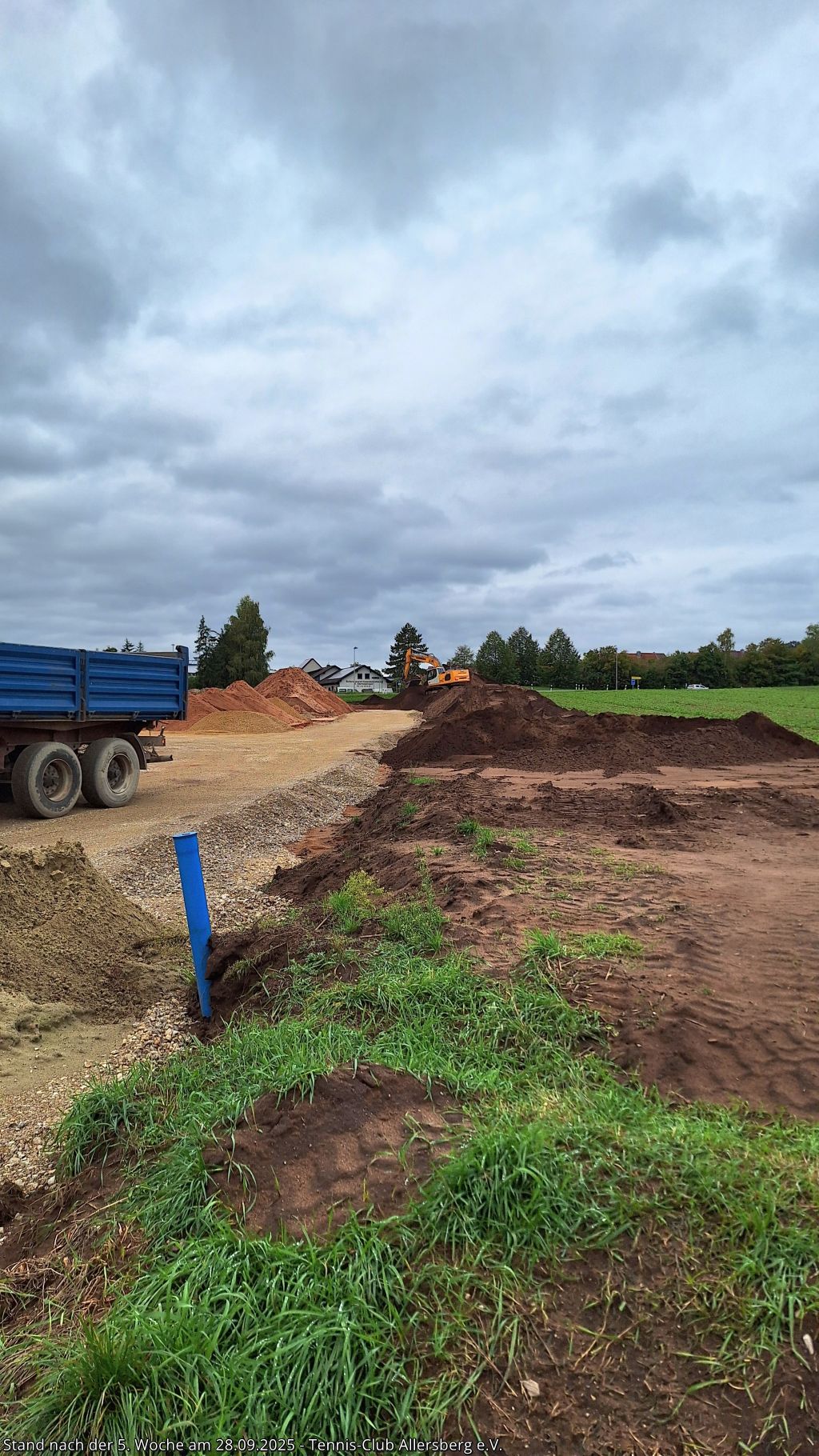 Seit unserem Spatenstich ist einiges passiert, ein Teil des überschüssigen Oberbodens wurde abtransportiert, der Unterbau der Plätze wurde vorbereitet, der Kanalanschluss für das Vereinsheim wurde erstellt, der Kran aufgestellt, sowie die Schalung für die Bodenplatte vorbereitet. Damit steht dem Gießen der Bodenplatte nichts mehr im Wege, auch das Mauern der Außenmauern wird im Laufe der folgenden Woche starten, ehe es auf den Sportplätzen weiter geht.