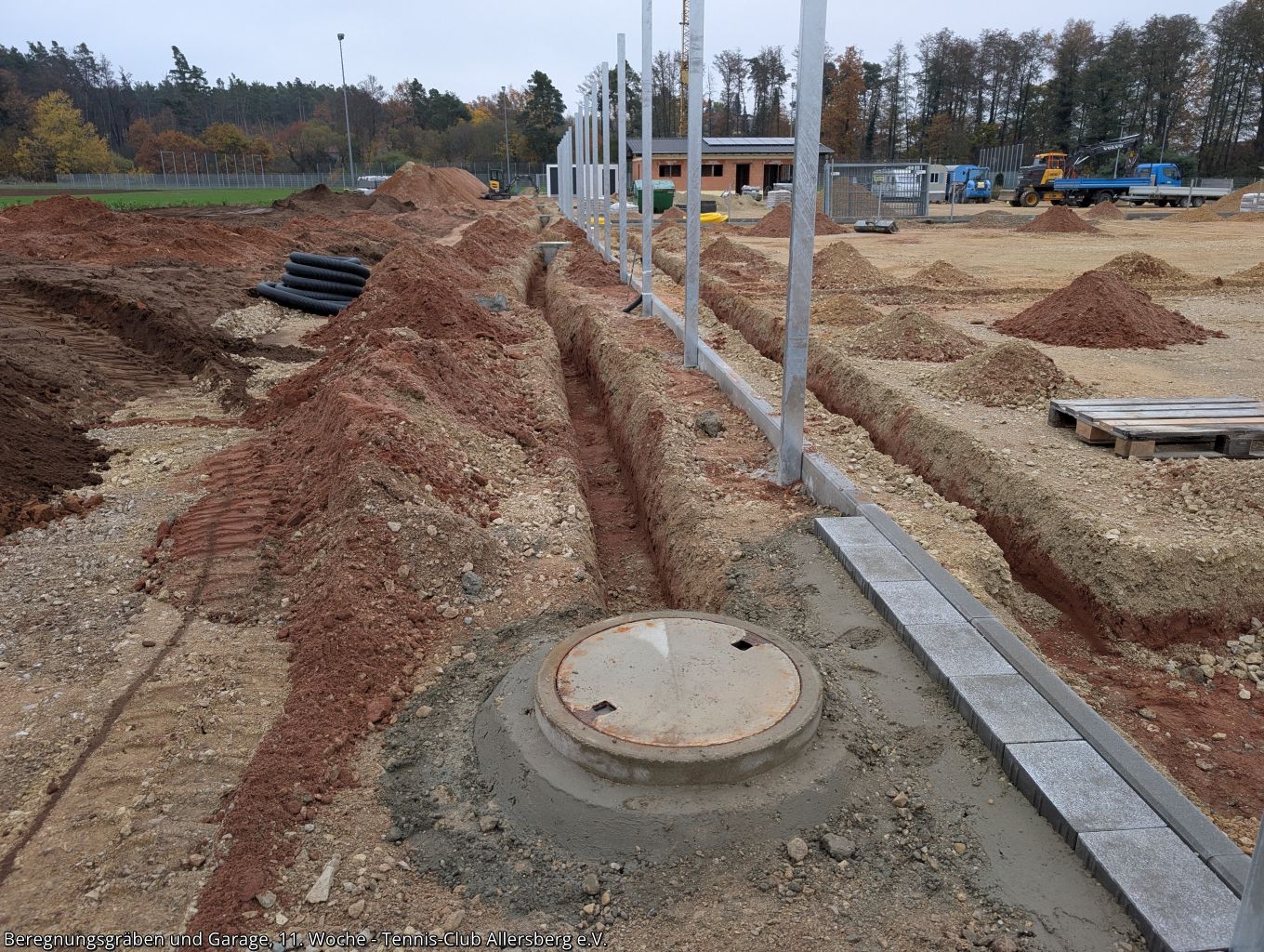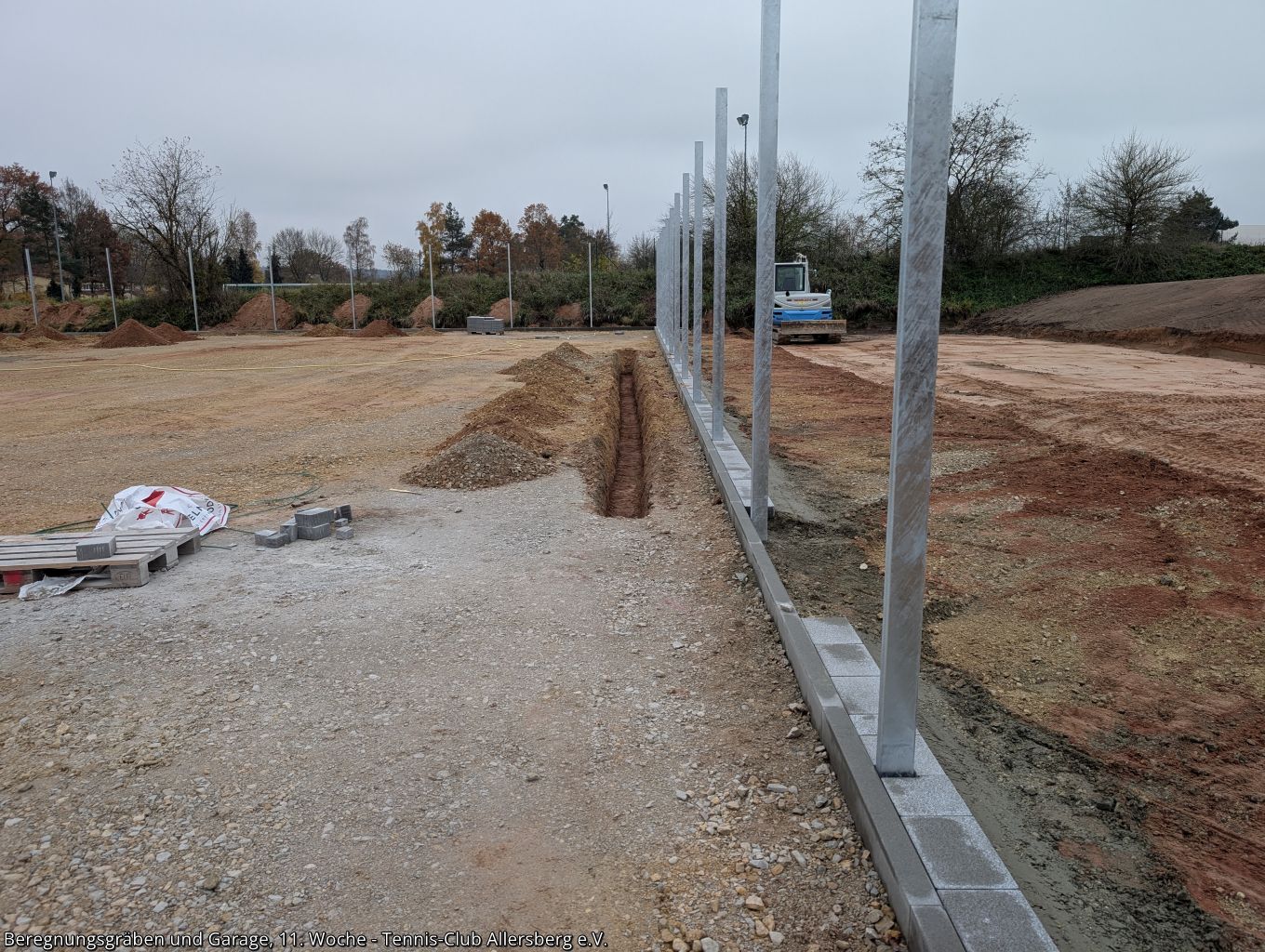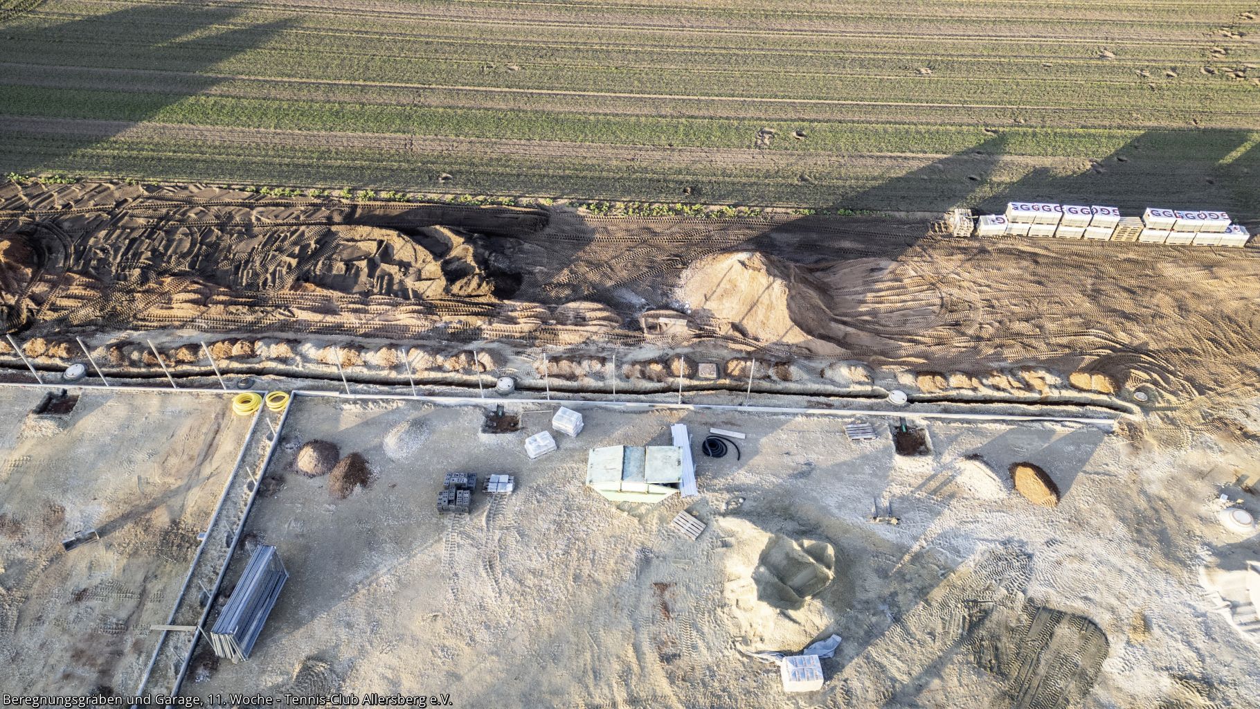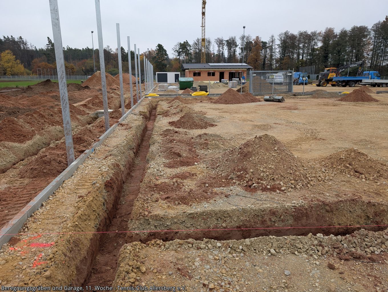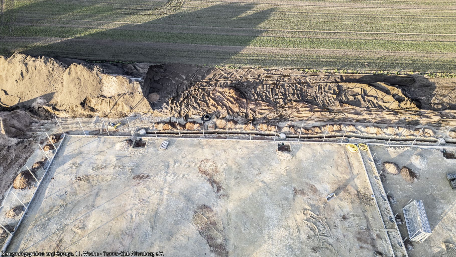 In der 11. Woche wurde die Zaunanlage weiter erstellt, sowie die Gräben für die Wasserversorgung der Beregnungsanlage gegraben. Auch die Garage, welche als Geräteraum dienen wird, wurde geliefert und auf den Streifenfundamenten aufgestellt.