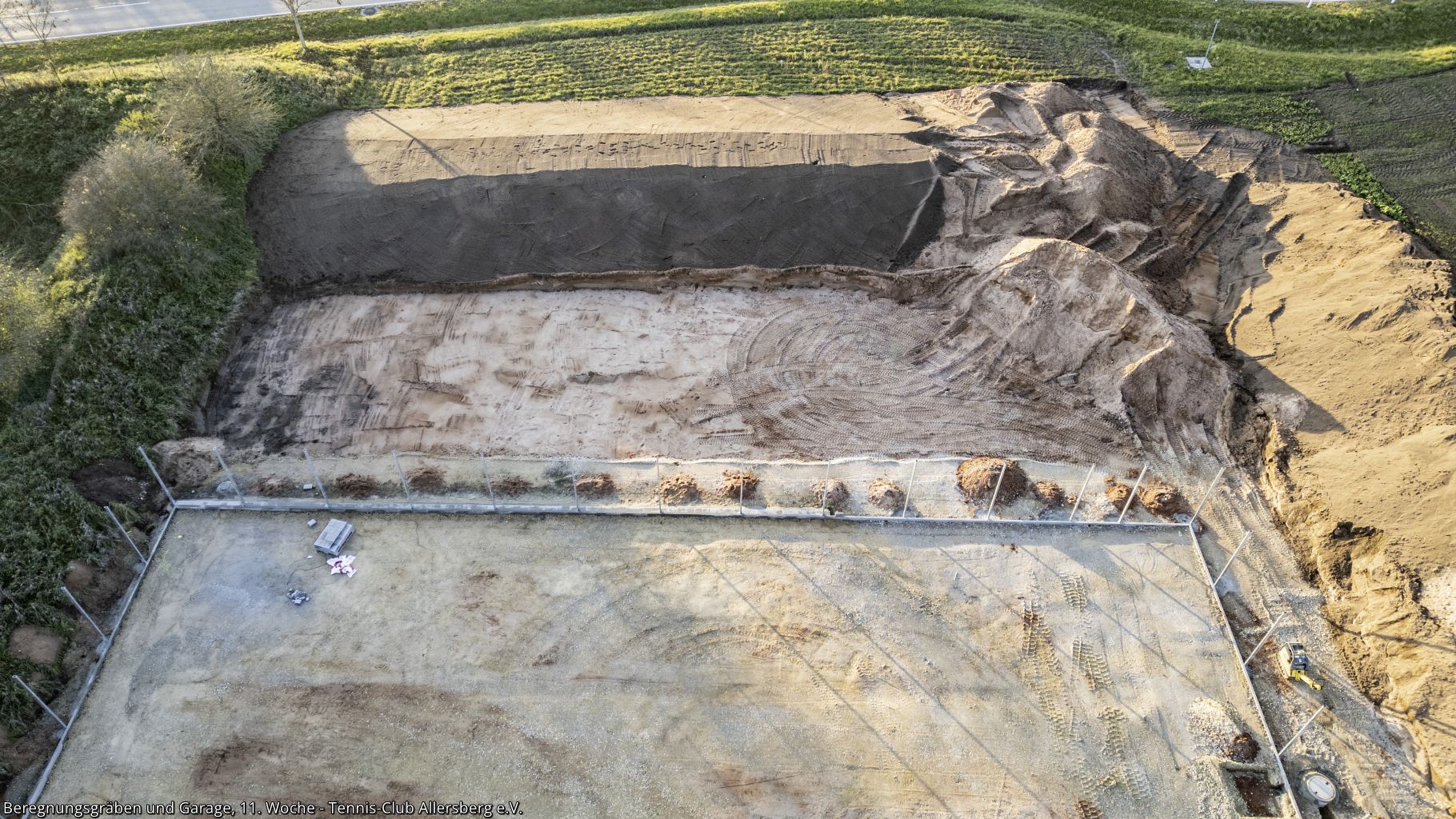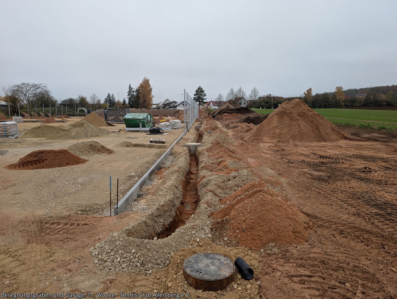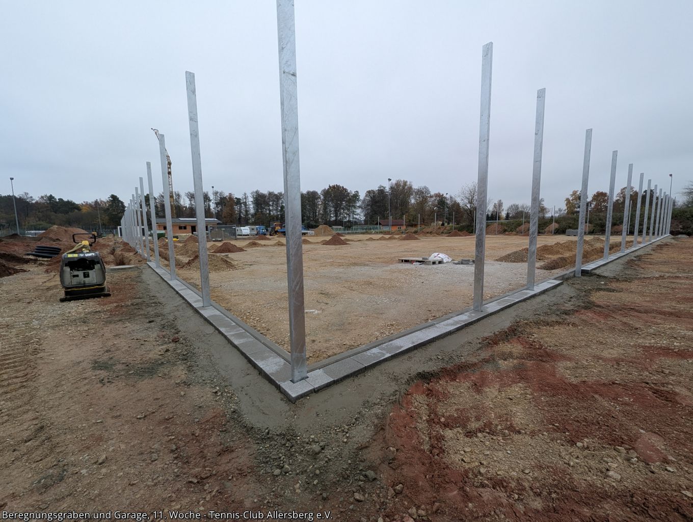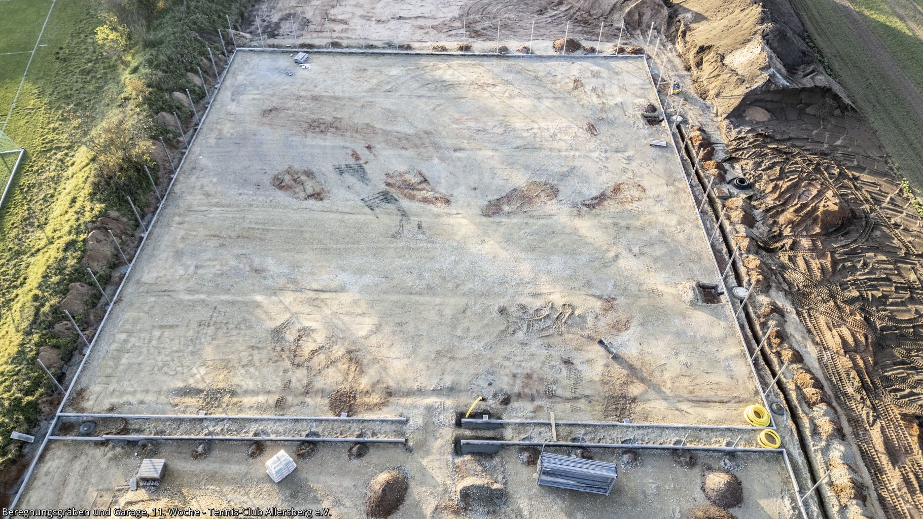 In der 11. Woche wurde die Zaunanlage weiter erstellt, sowie die Gräben für die Wasserversorgung der Beregnungsanlage gegraben. Auch die Garage, welche als Geräteraum dienen wird, wurde geliefert und auf den Streifenfundamenten aufgestellt.