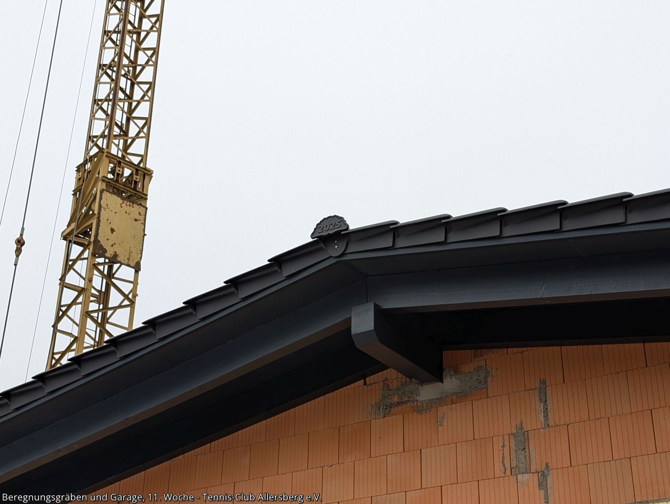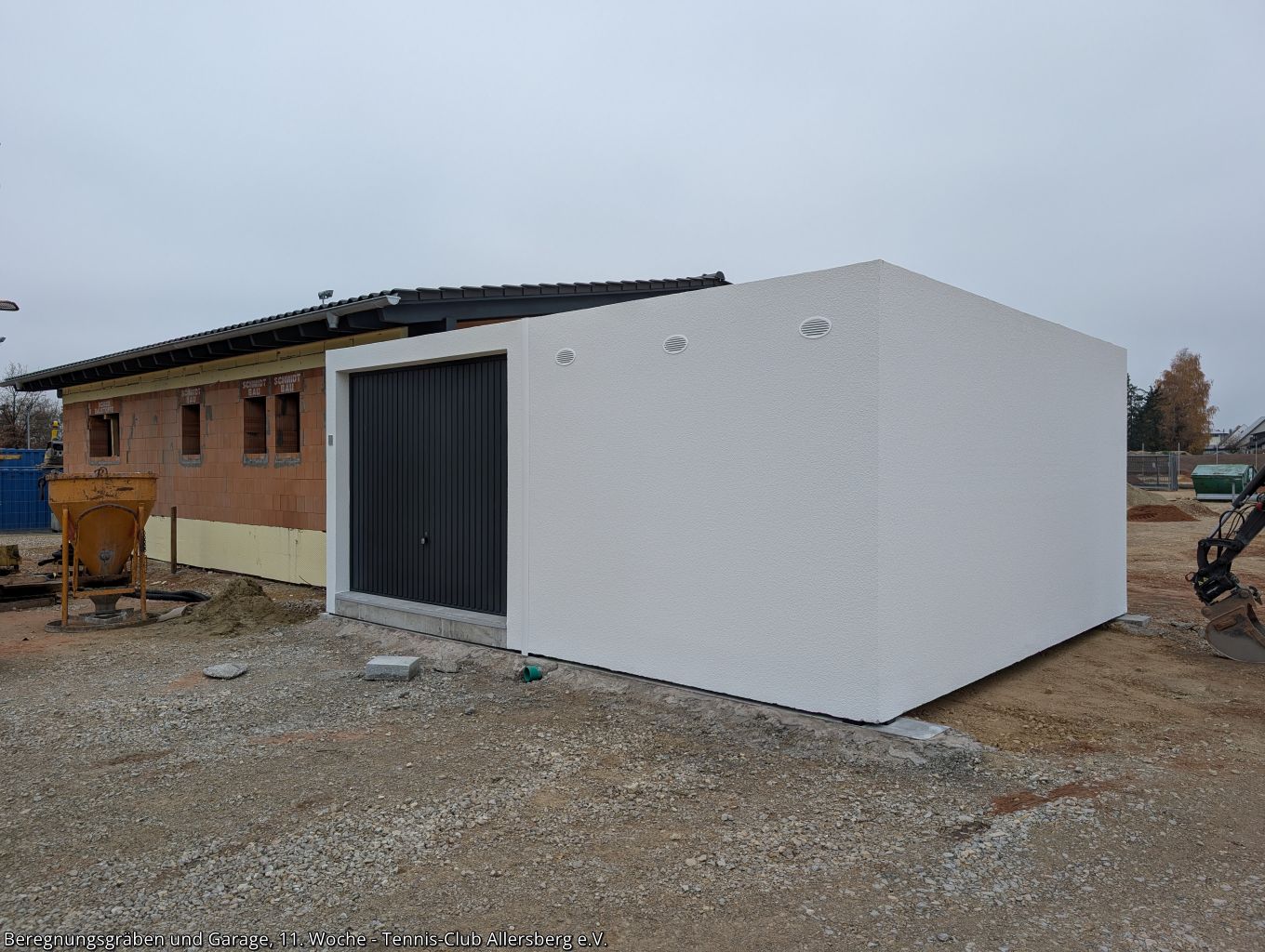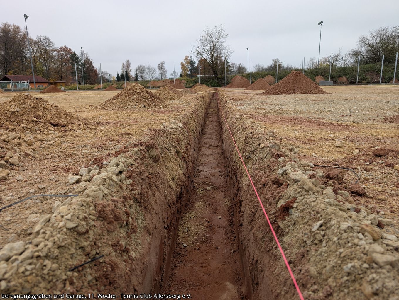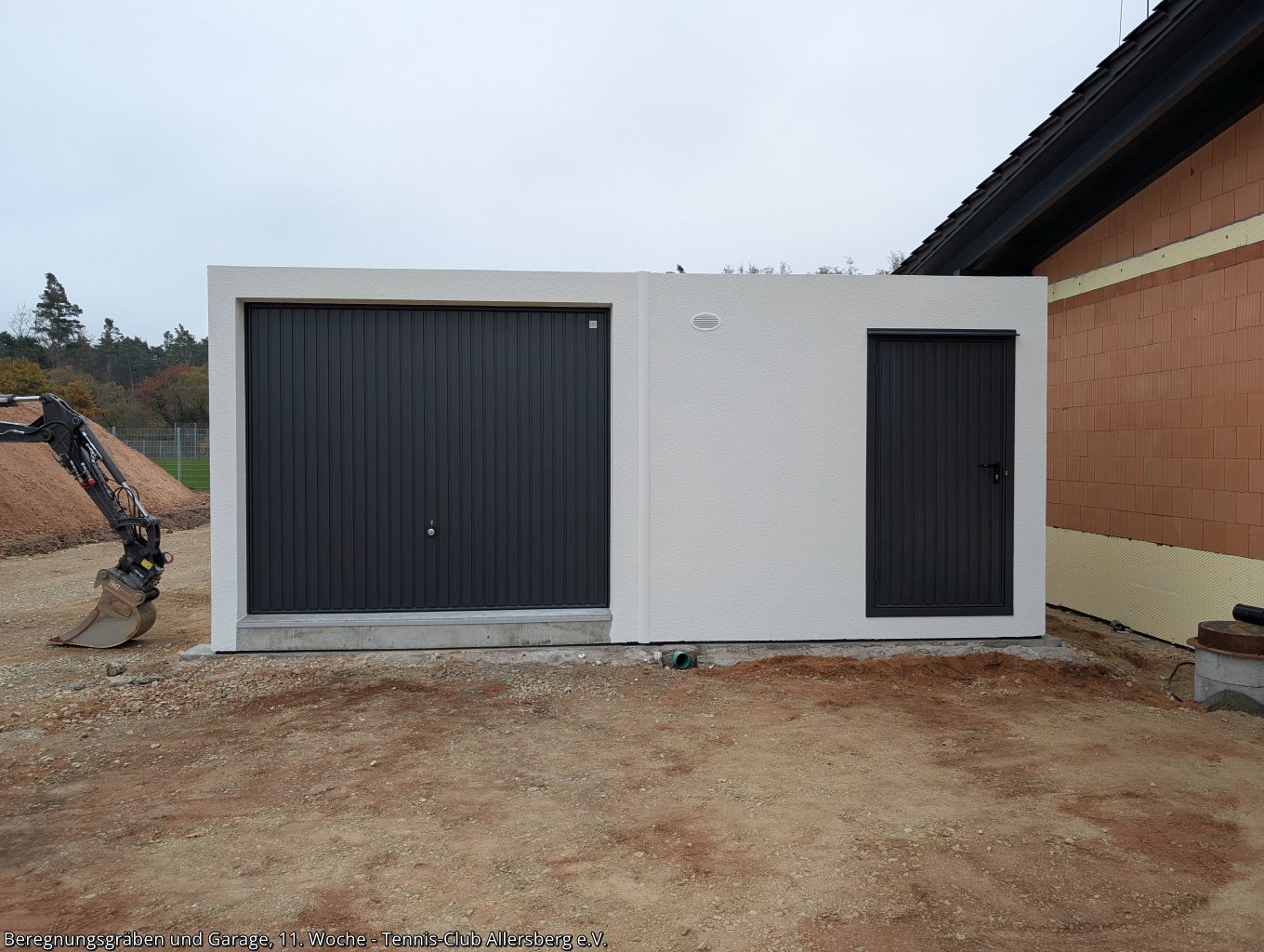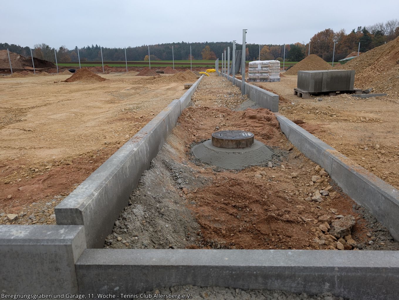 In der 11. Woche wurde die Zaunanlage weiter erstellt, sowie die Gräben für die Wasserversorgung der Beregnungsanlage gegraben. Auch die Garage, welche als Geräteraum dienen wird, wurde geliefert und auf den Streifenfundamenten aufgestellt.